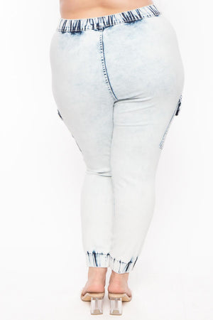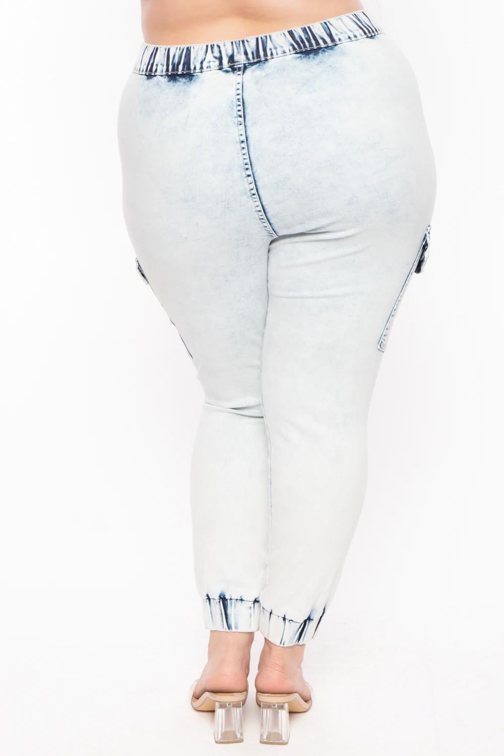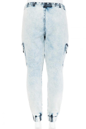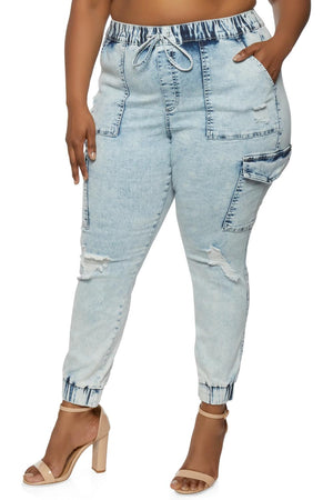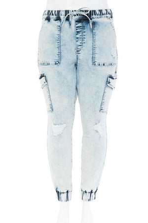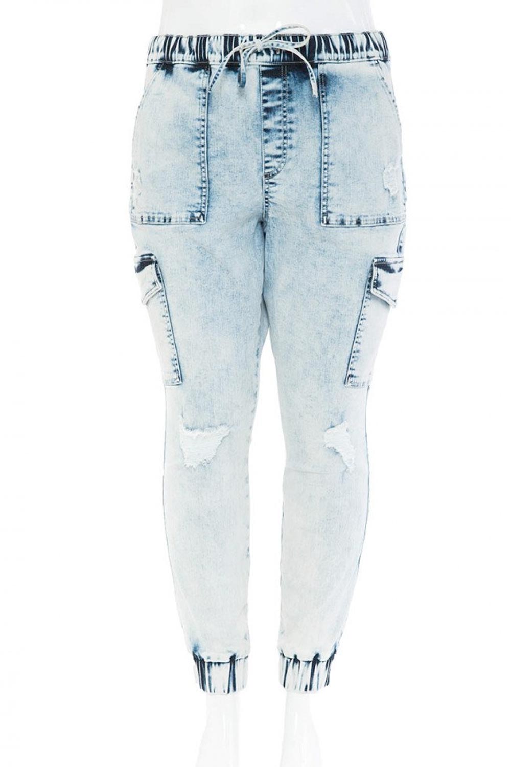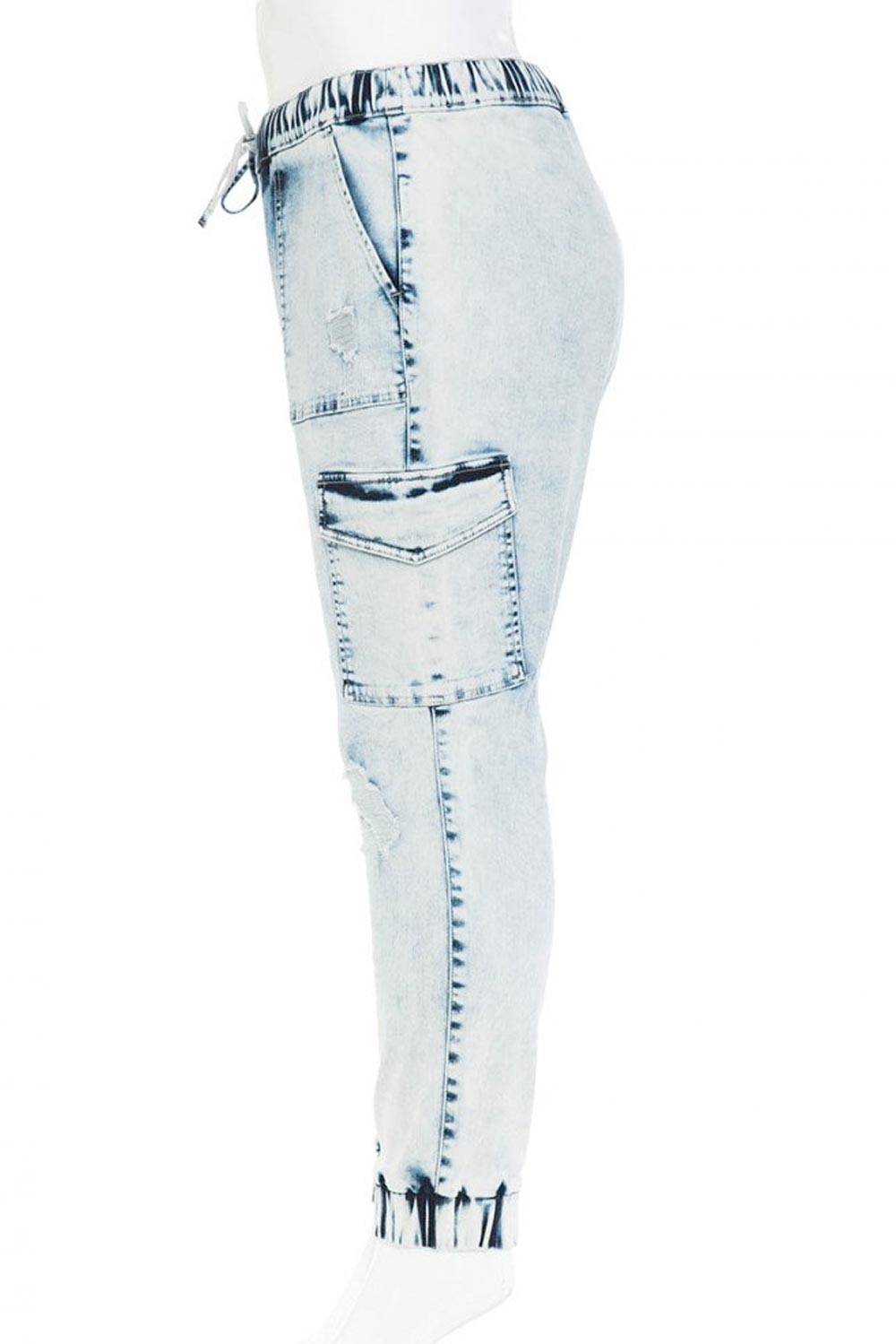 Geggjaðar ljósar Cargo gallabuxur með vösum á hliðinni og rifur og tjásur yfir hnén.