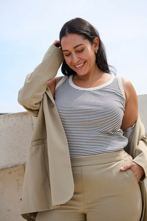Efnið í toppnum er mjúkt og teygjanlegt: 95% bómull og 5% elastine.