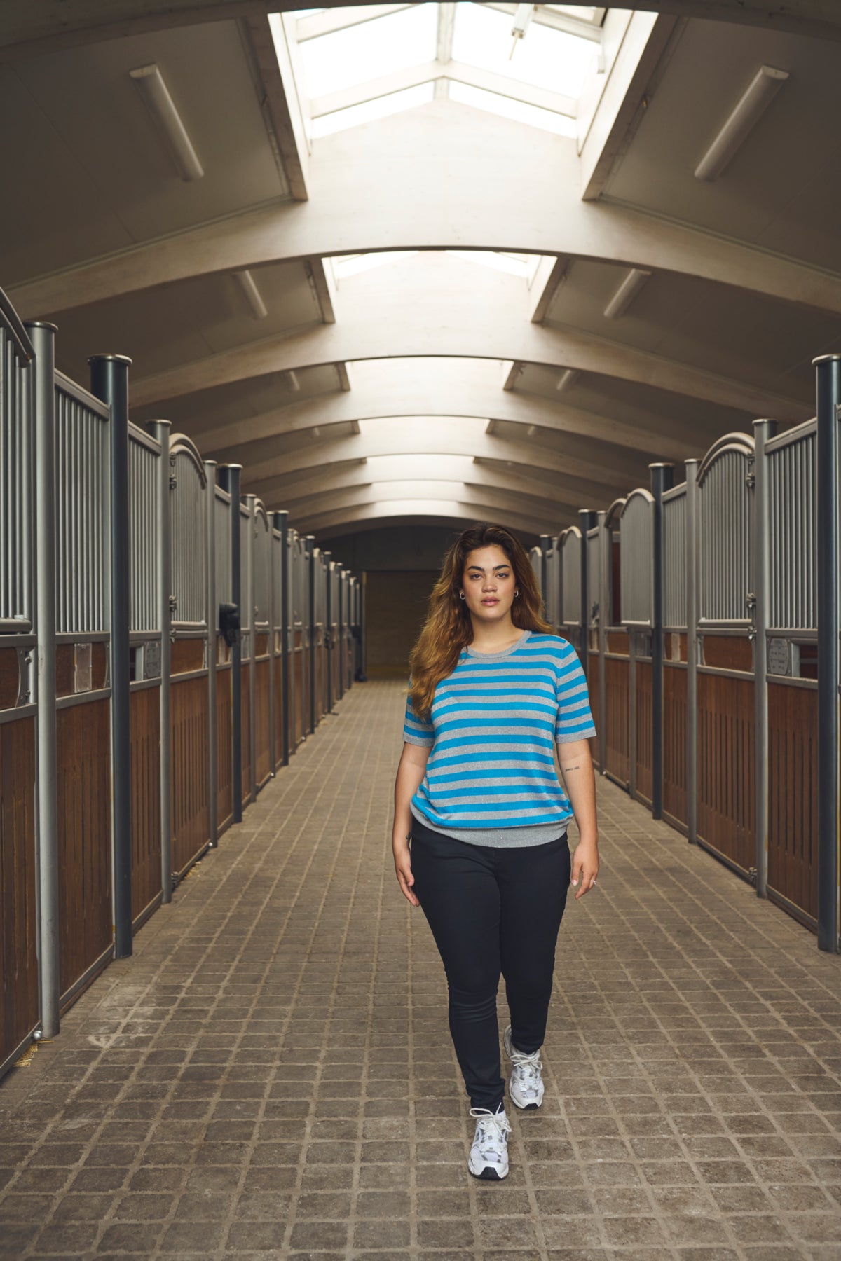 Peysan er með stuttum ermum og rúnuðu hálsmáli.