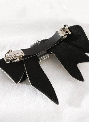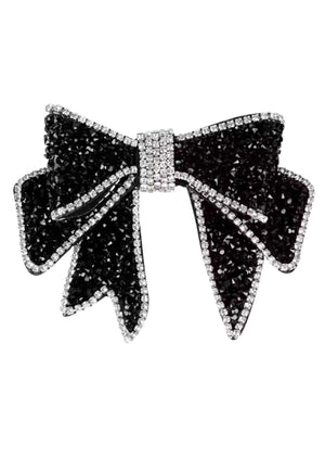 Sparileg spenna sem er í laginu eins og slaufa, nema hún er þakin litlum silfruðum og svörtum skraut steinum.