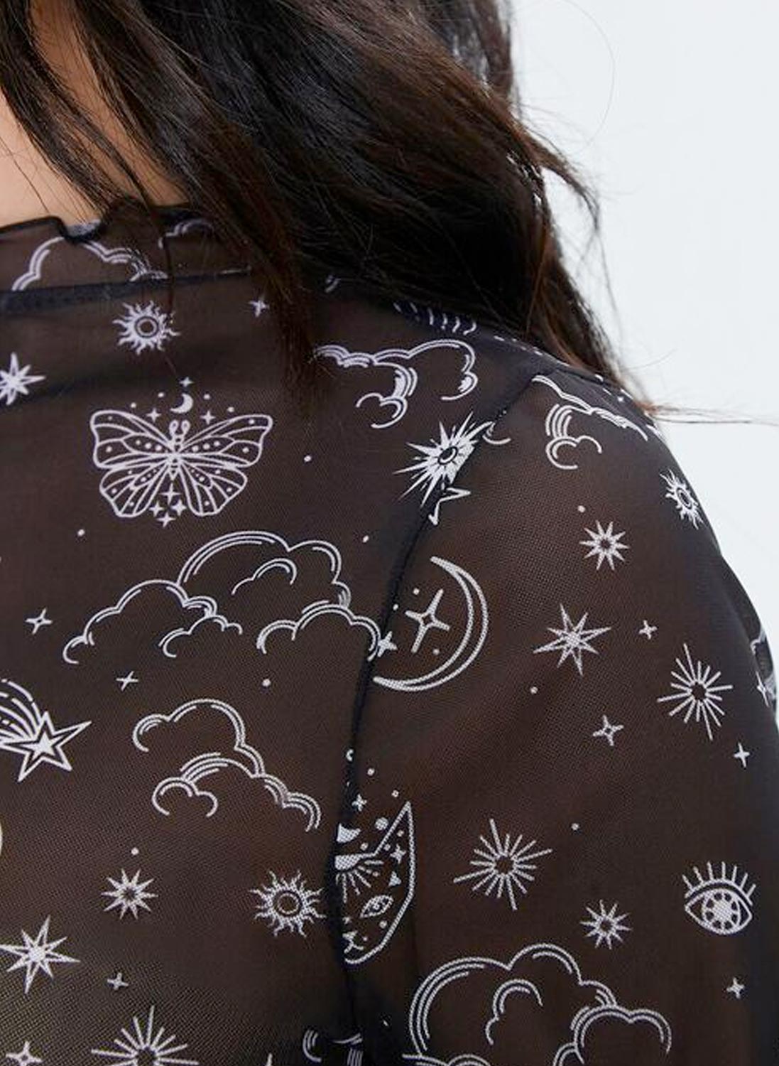 Toppurinn er aðeins gegnsær svo hann er sætur yfir annan top eða undir ermalausan topp eða kjól.