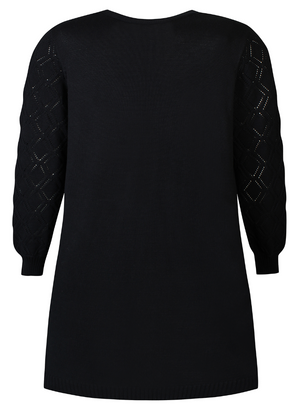 Rifflað prjónamynstur og klæðilegt A-snið er á peysunni.