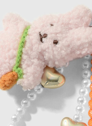 Töskuskrautið er samansett af hjartalaga krækju, ljósbleikum kanínubangsam hvítum perlum og reimum.