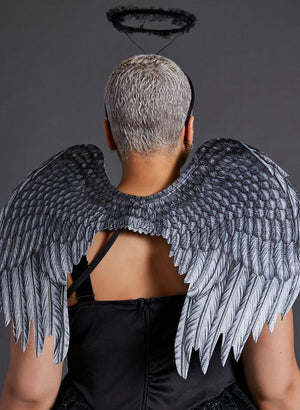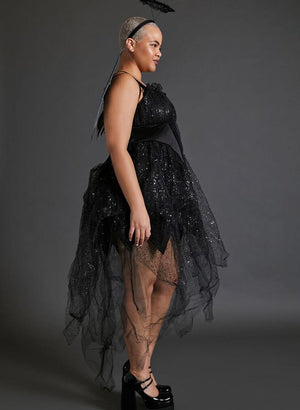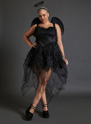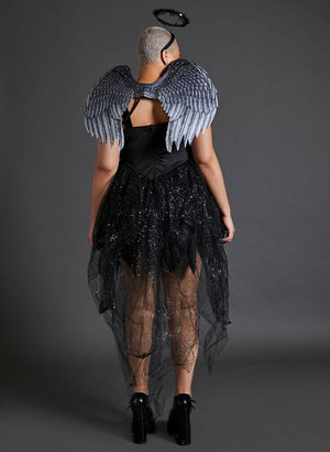 Búninga-sett sem inniheldur 3 hluti - svartur kjóll með tjull pilsi og glimmeri , vængir með áprentuðum fjöðrum og svo svartur engla baugur.