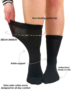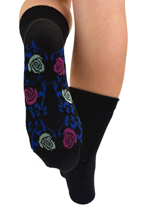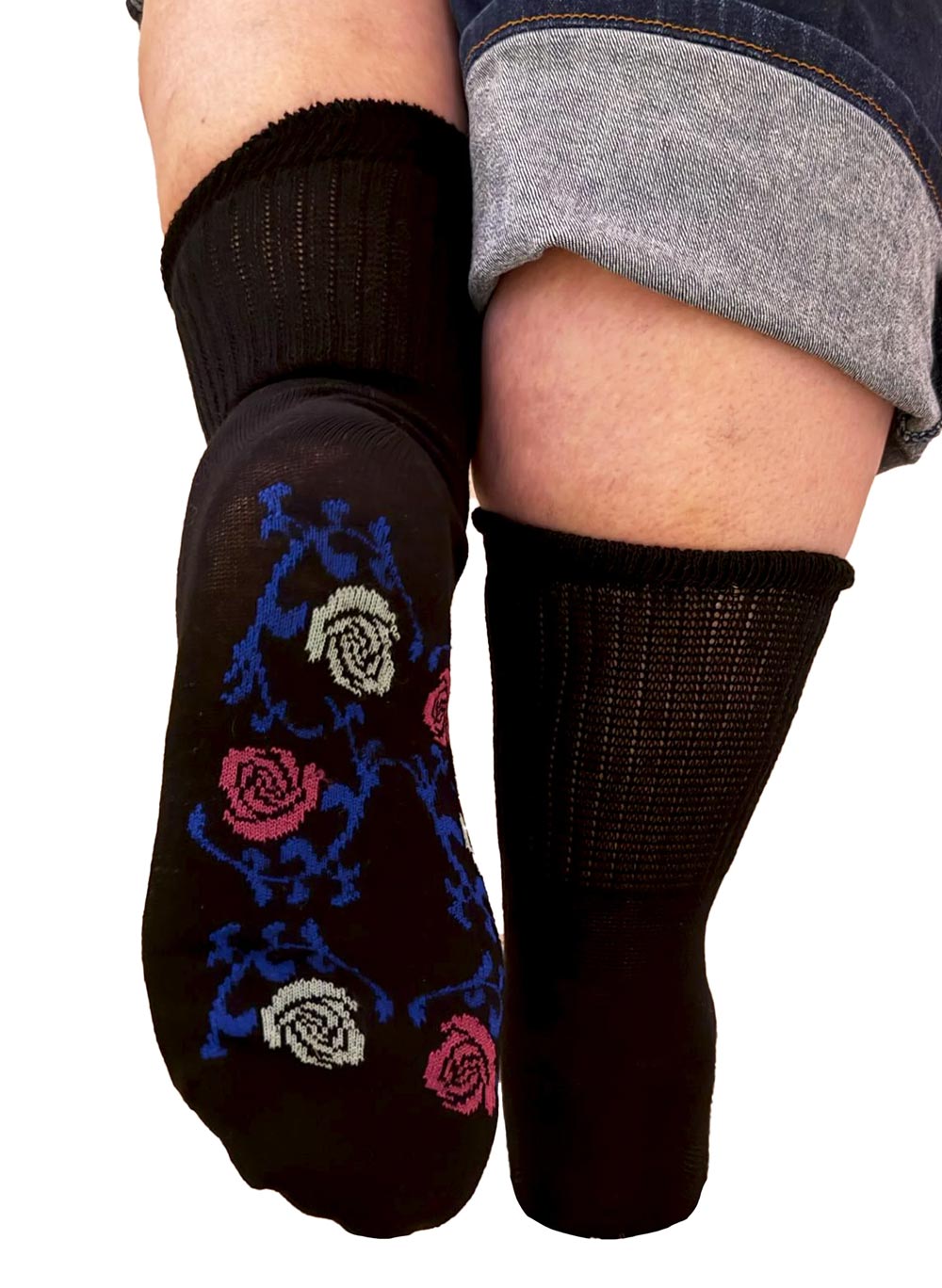 Sokkarnir eru svartir í grunninn með blómamynstri undir ilinni.