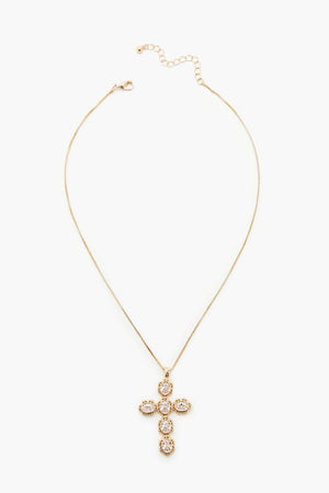 Geggjað gyllt hálsmen með fínlegri gylltri keðju og grófum kross með silfruðum skrautsteinum.