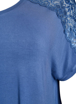 Rúnnað hálsmál , stuttar ermar og blúnda yfir öxlunum.