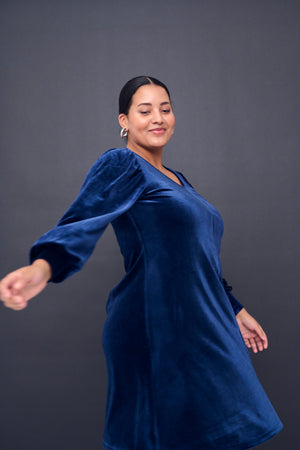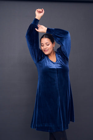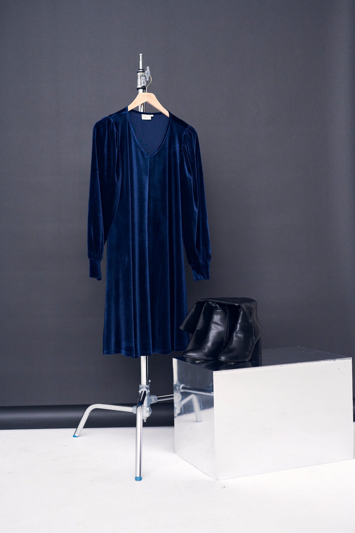 Efnið er mjúkt og teygjanlegt - fínlegt velúr efni í fallegum bláum lit.