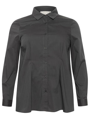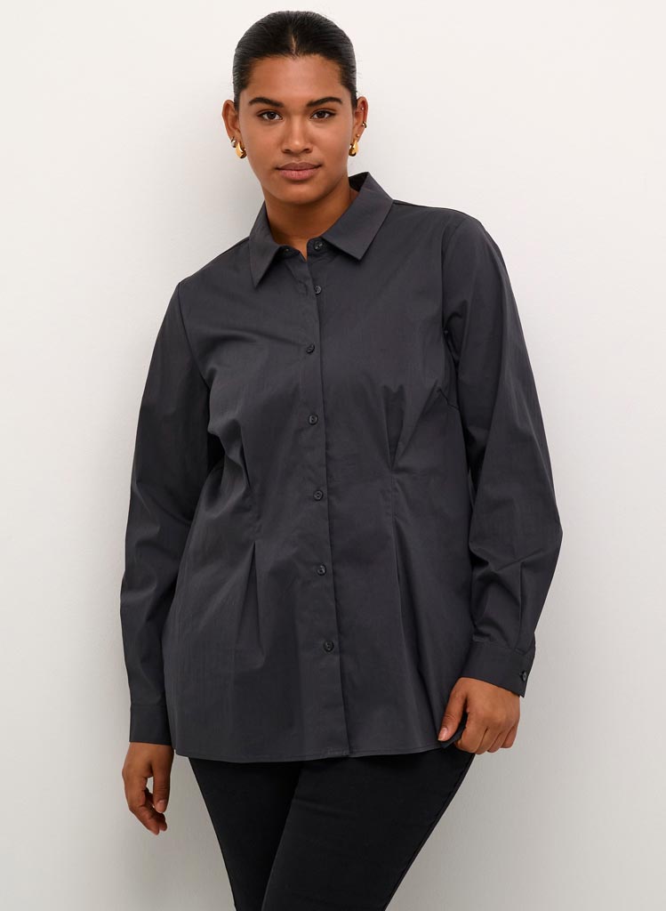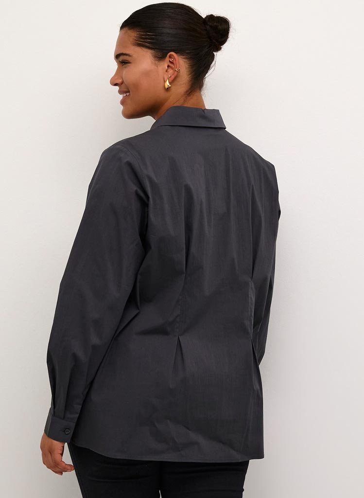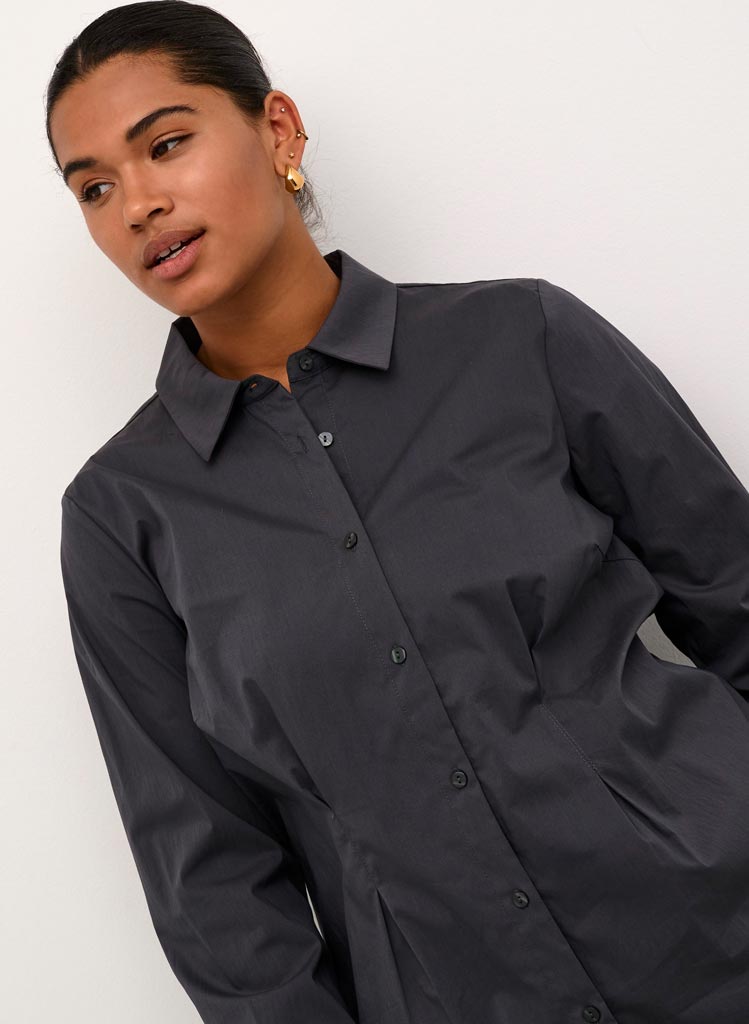 Dökkur grár litur, klassískur skyrtukragi og hneppt alla leið niður og kvenlegt snið.
