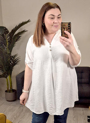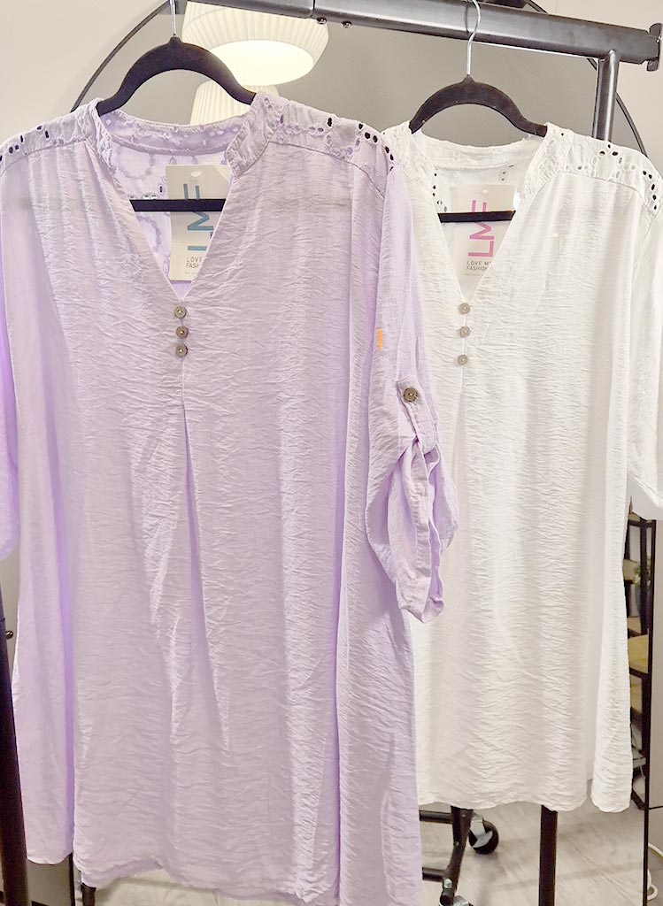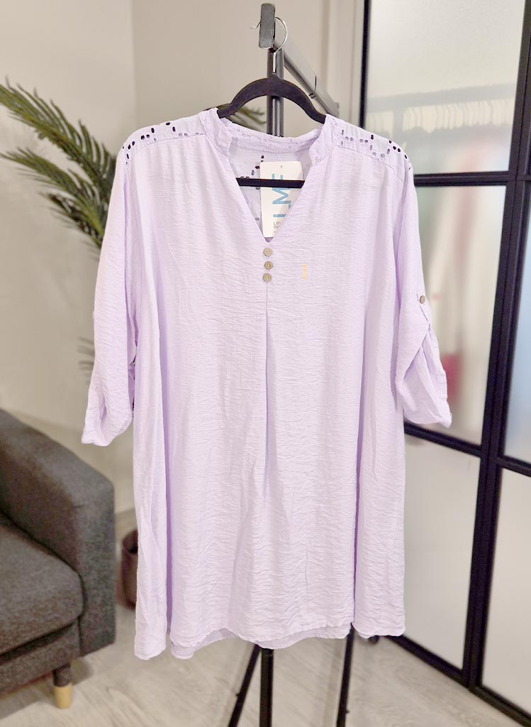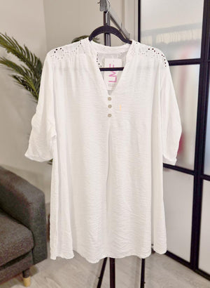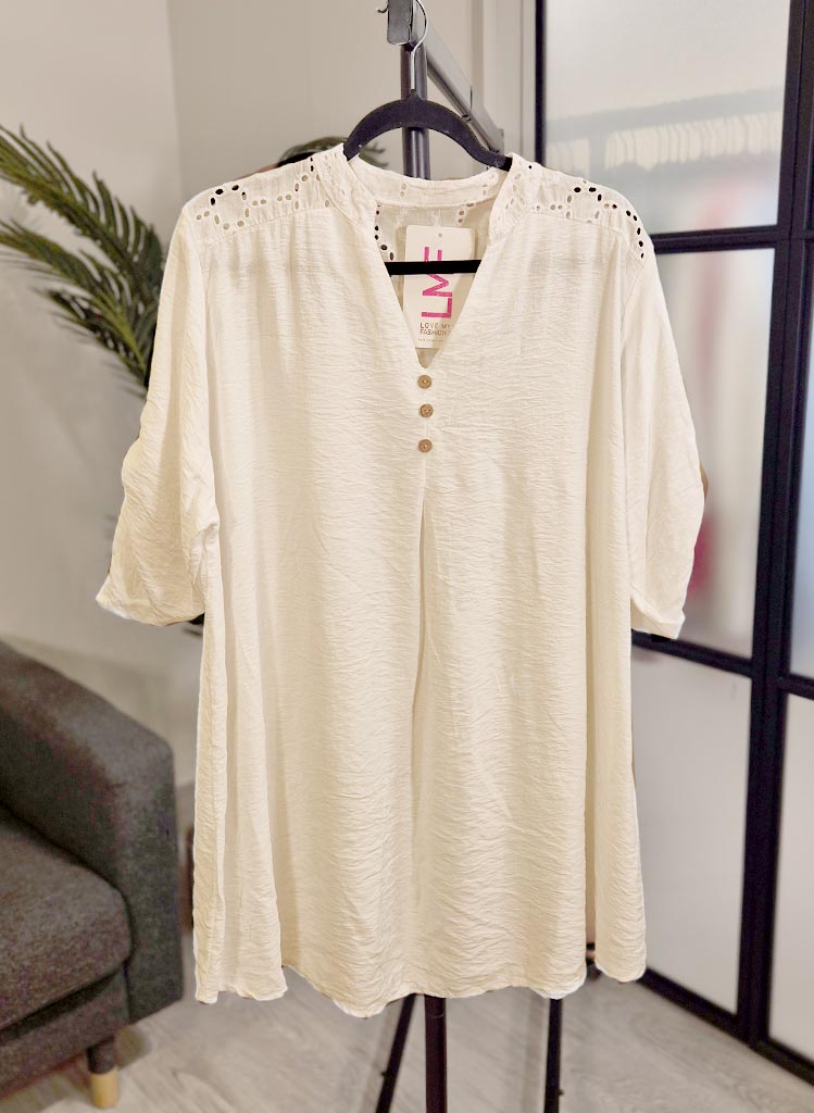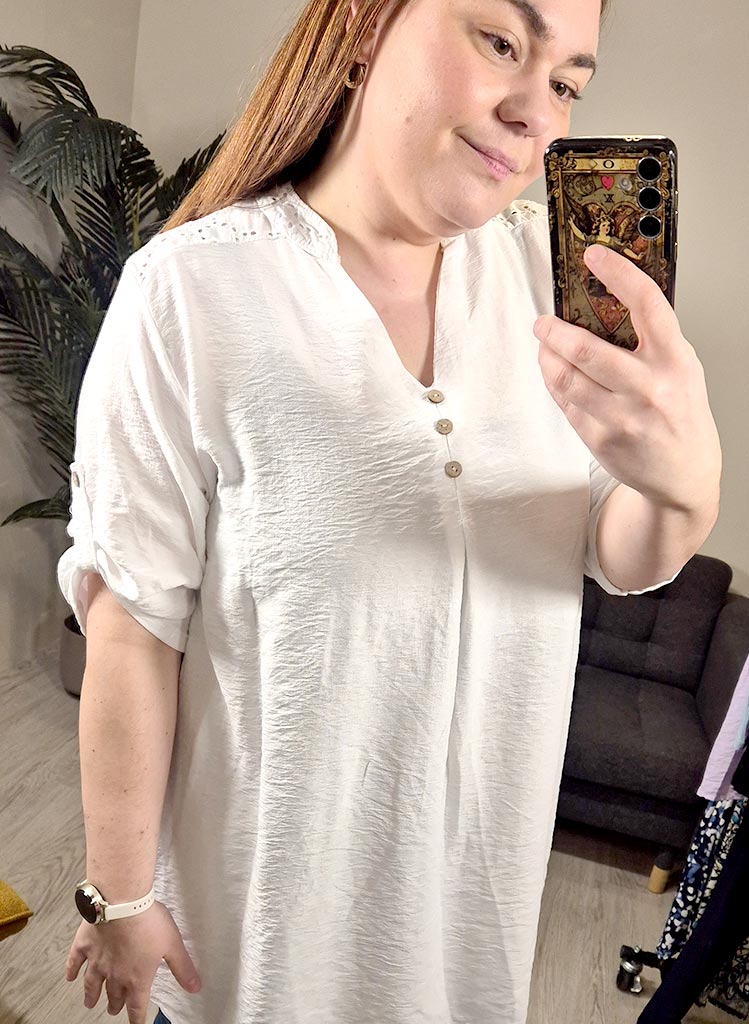 Létt sumarleg túnika með V-hálmsáli hálfum ermum og bróderuðu blúndu efni yfir axlirnar.