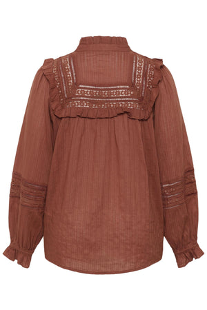 Skyrtan er með blúndu og pífu skrauti við hálsmálið og aðeins á ermunum.