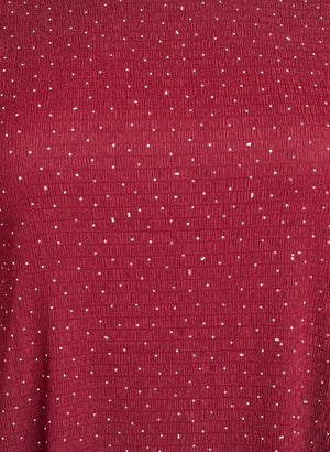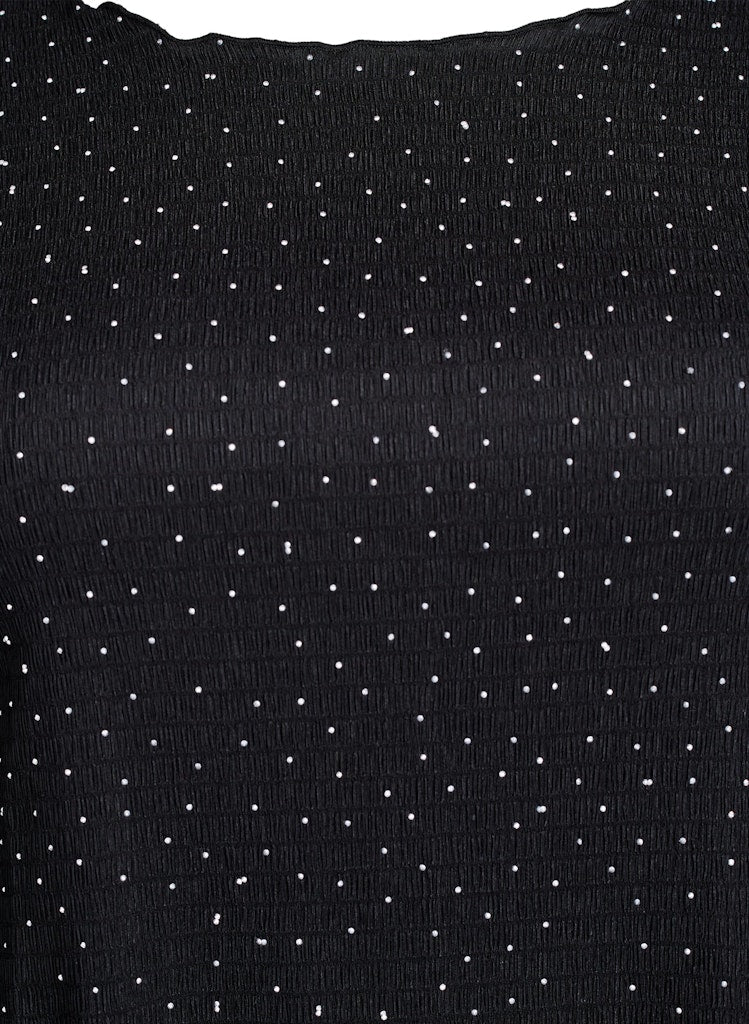 Kjóllinn er þakinn glitrandi steinum að framan og efnið með skemmtilegri rifflaðri áferð.