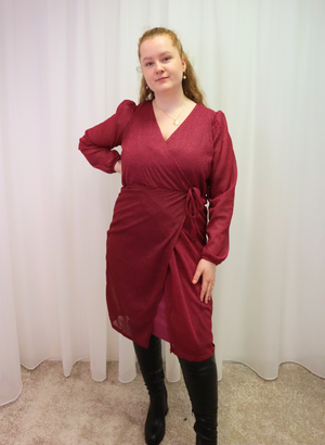 Fallegur og sparilegur kjóll með lokuðu wrap sniði og V-hálsmáli.