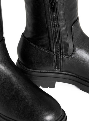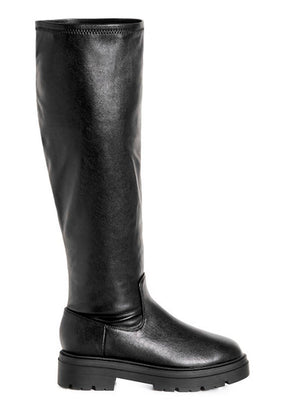 Ótrúlega flott og þægileg WIDE FIT há pleðurstígvél með með mattri áferð og teygjanlegu pleðurefni sem fer upp kálfann svo það er auðvelt að smeygja sér í stígvélin.