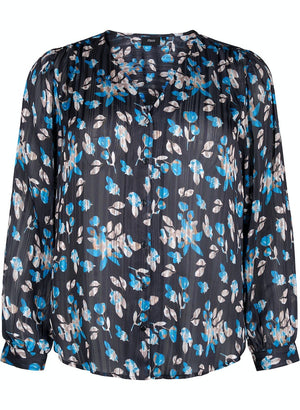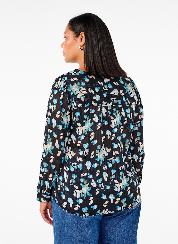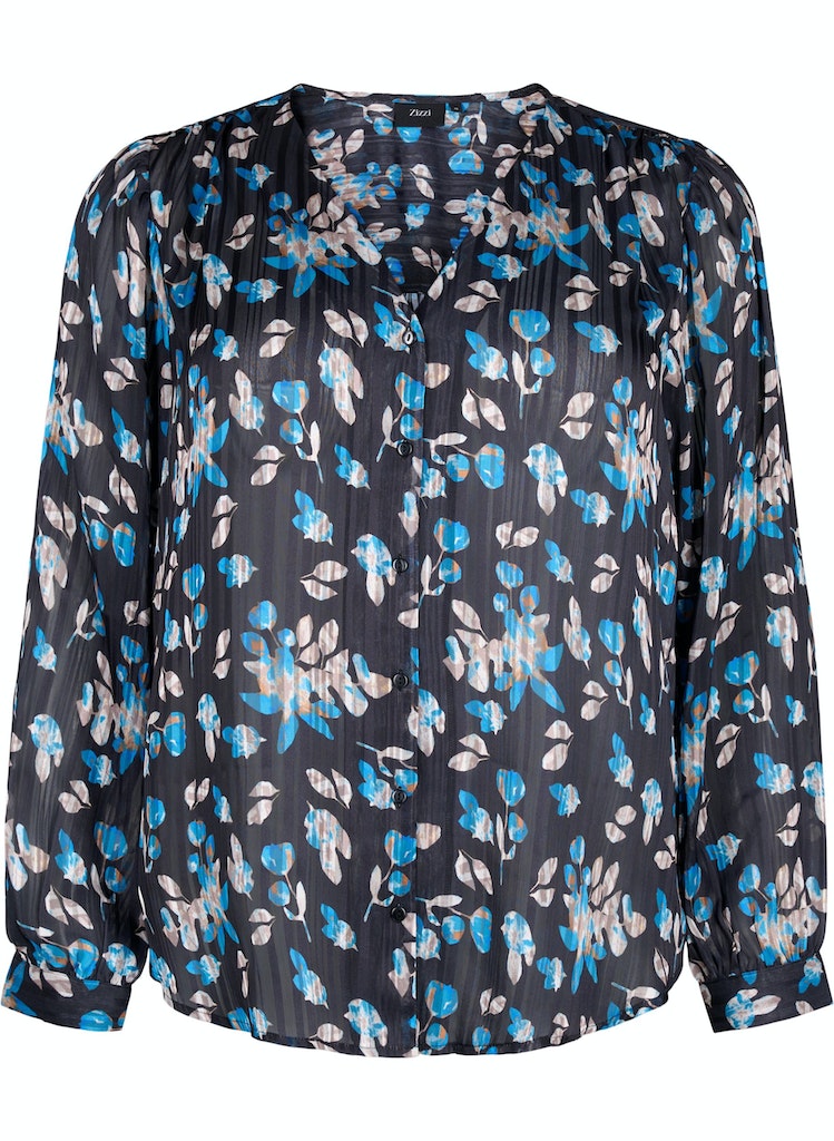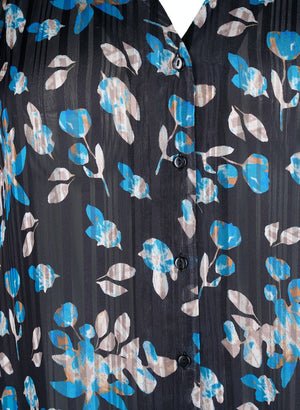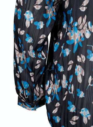 Blússan er hálfgegnsæ - svört í grunninn með fallegu bláu og brúntóna blómamynstri.