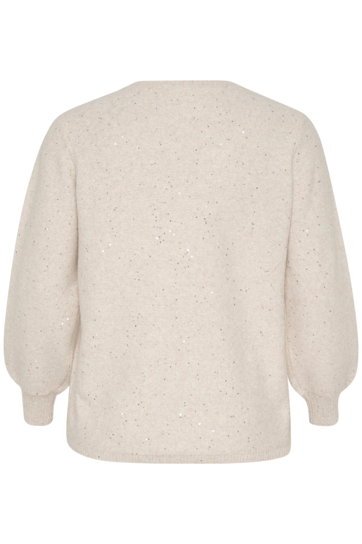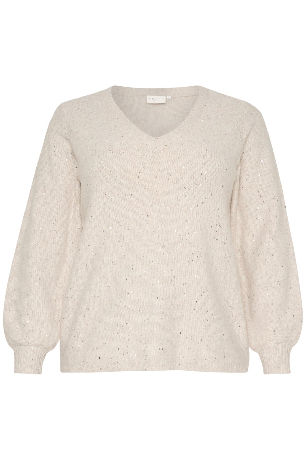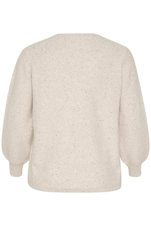 Peysan er fínlega prjónuð í mildur ljós sandlitur og litlar ljósar pallíettur sem setja svip sinn á peysuna.
