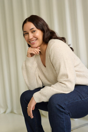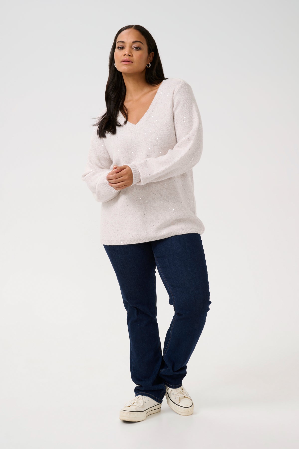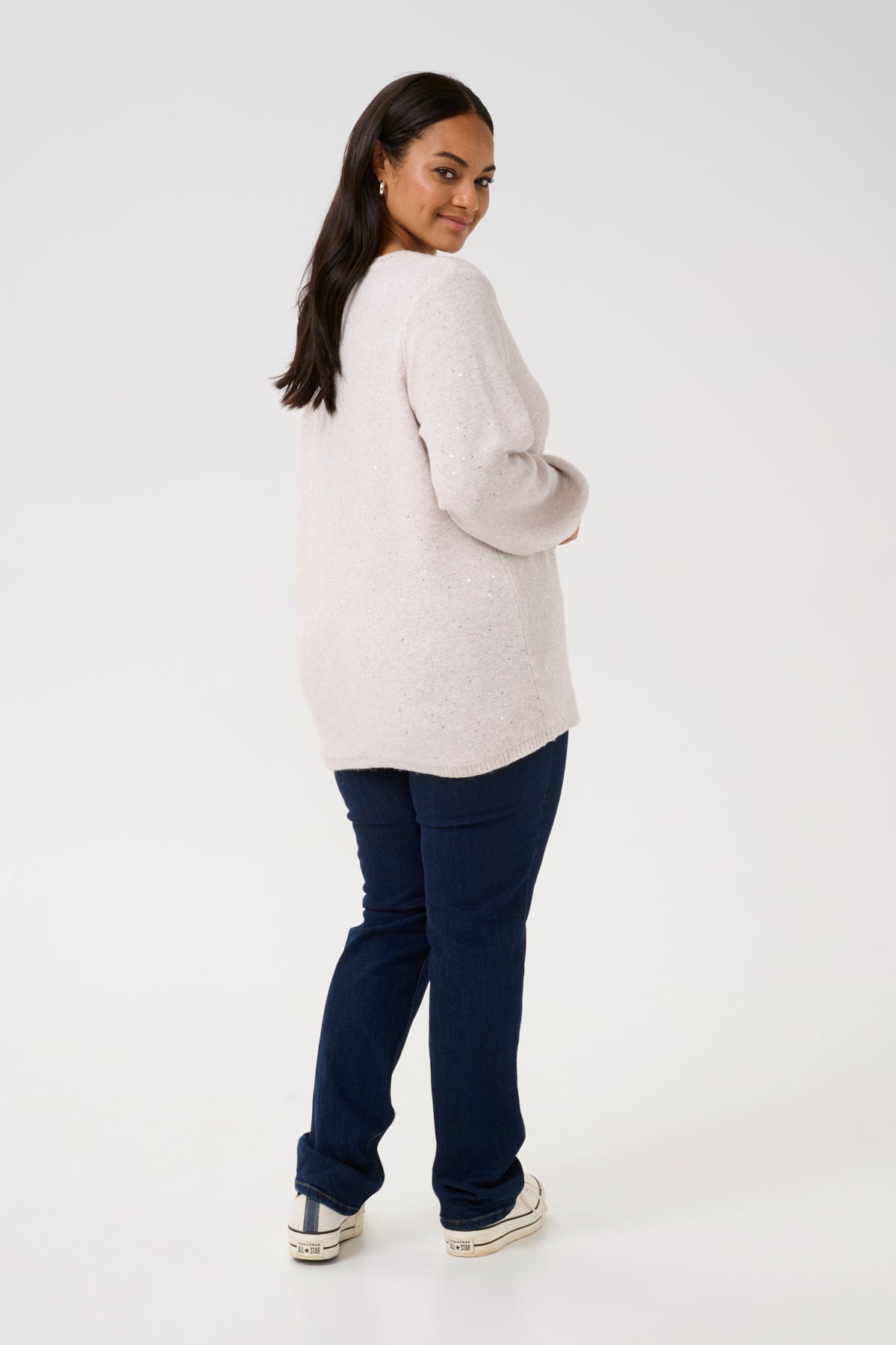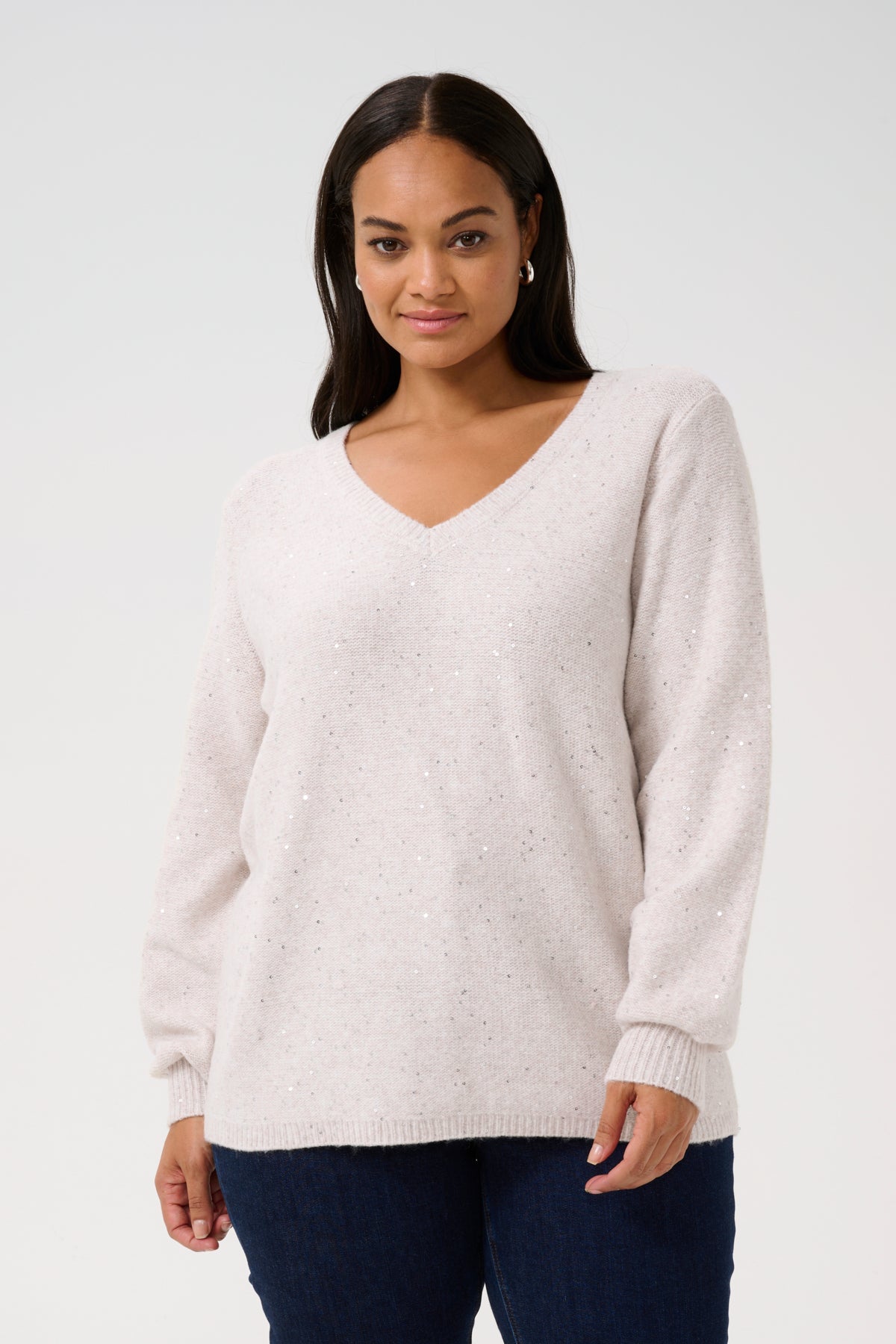 Peysan er fínlega prjónuð í mildur ljós sandlitur og litlar ljósar pallíettur sem setja svip sinn á peysuna.