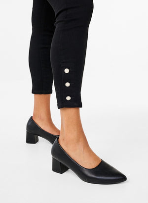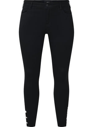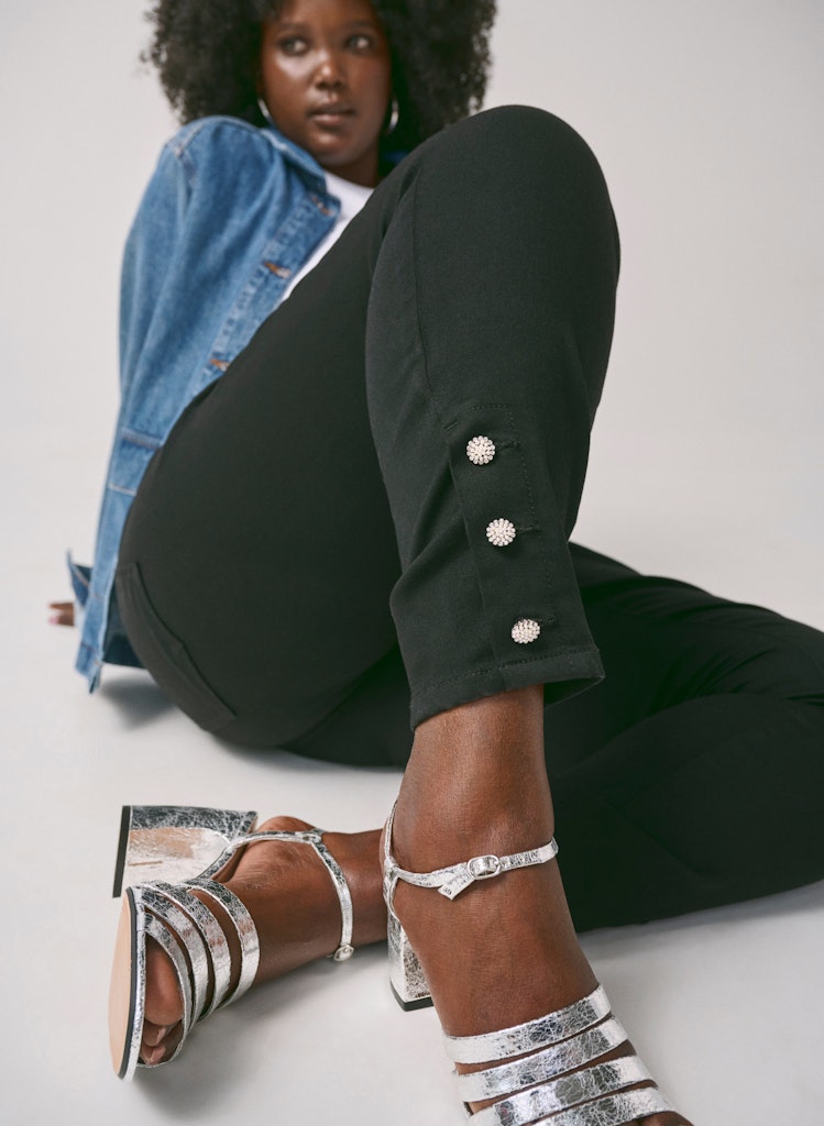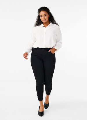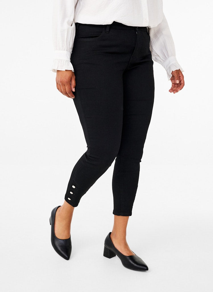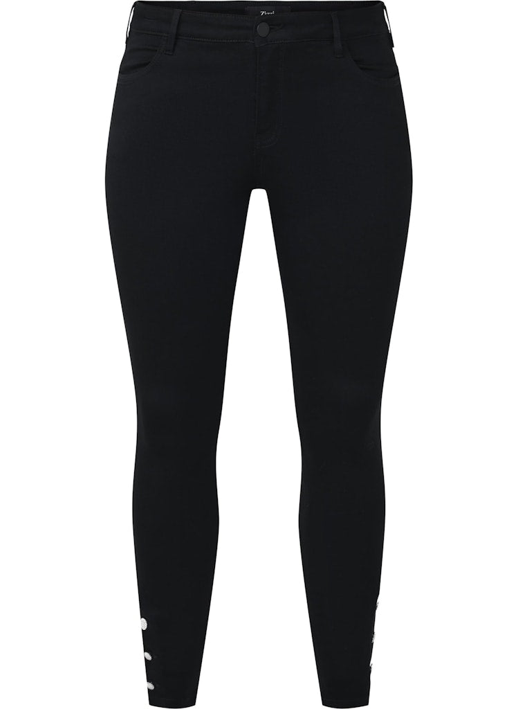 Þessar eru aðeins öðruvísi en þær klassísku því þær eru í "cropped" skálmasídd sem er styttri en vanalega og svo eru fallegar skrauttölur neðst.