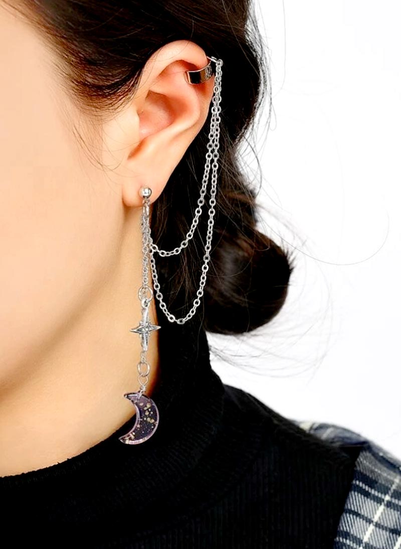 Skemmtilegir eyrnalokkar þar sem annar lokkurinn tengist aukakeðju sem hægt er að krækja upp á eyrað.