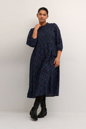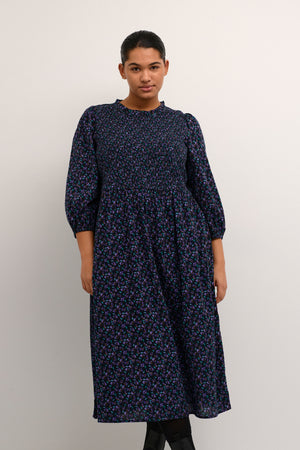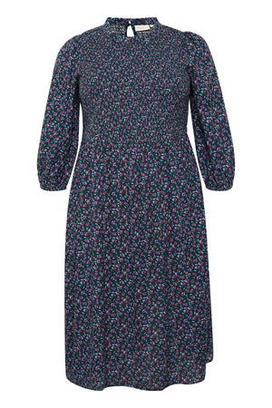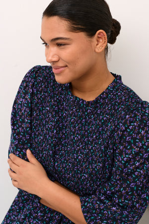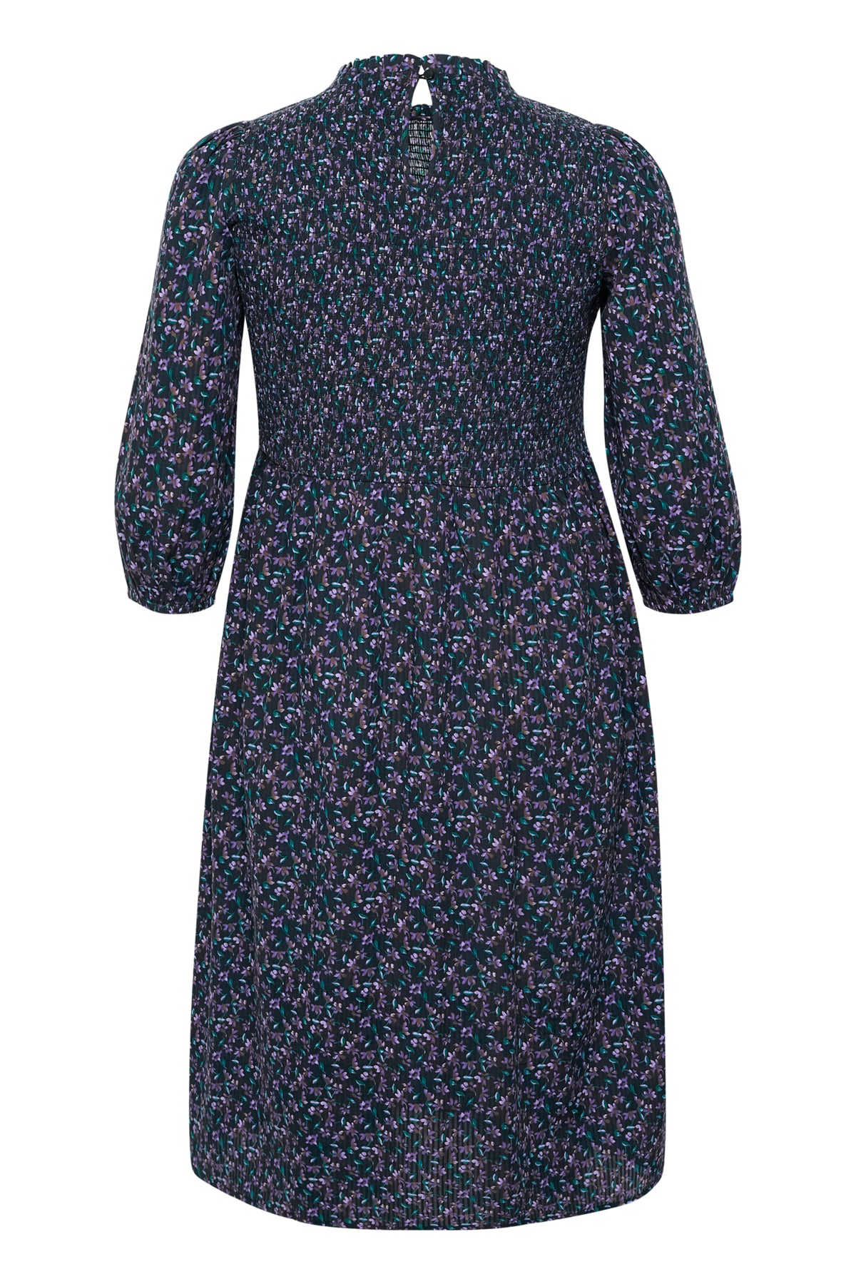 dökkblár í grunninn með smáu blómamynstri í fjólubláu og grænum tónum