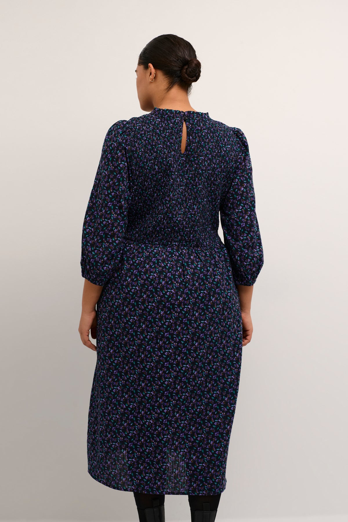 Kjóllinn er með háu hálsmáli, teyganlegt brjóst stykki og rykktar lausar kvart ermar