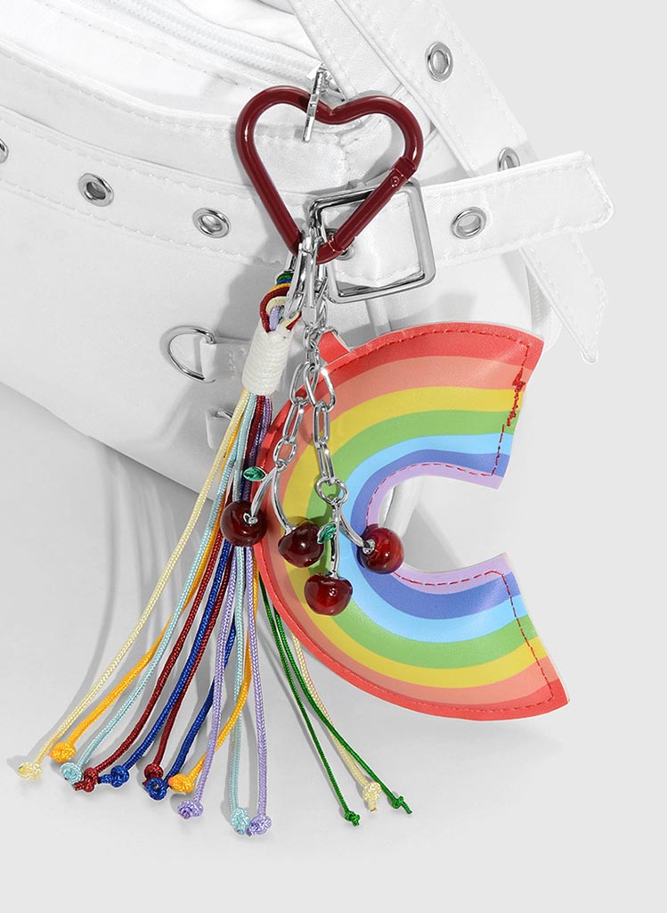 Töskuskrautið er samansett af hjartalaga krækju, regnboga, litlum kirsuberjum og litríku regnboga tassel.