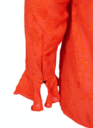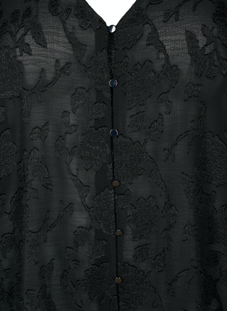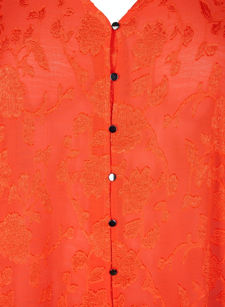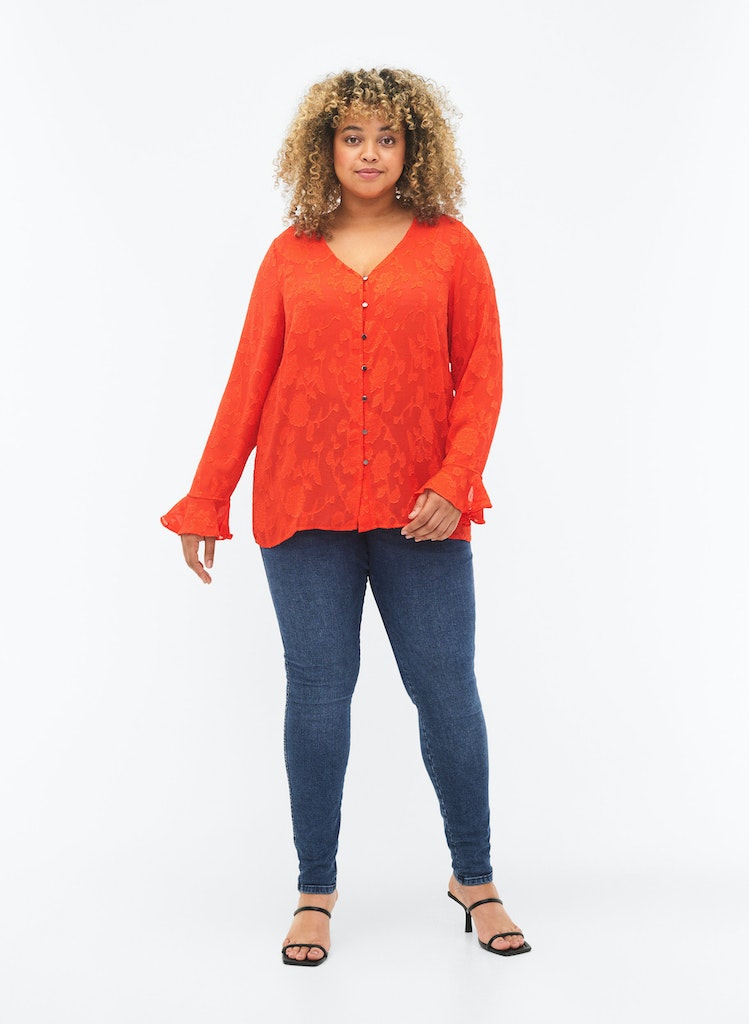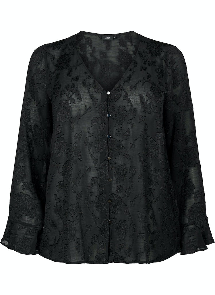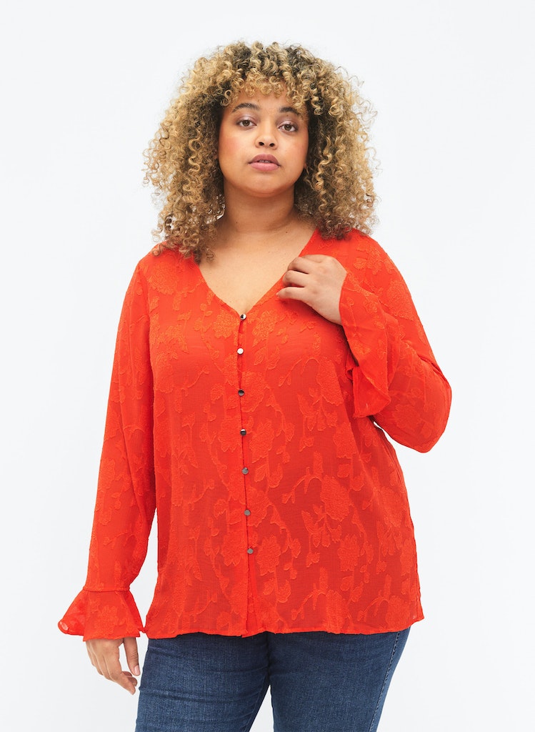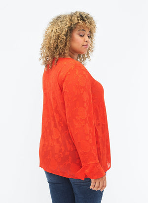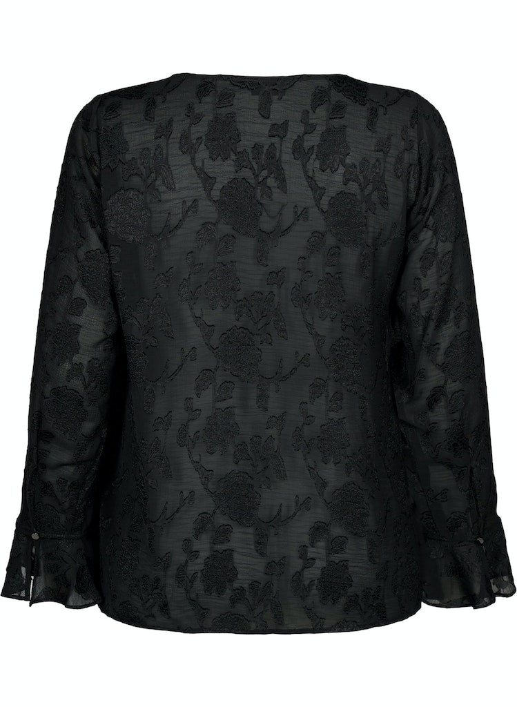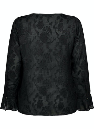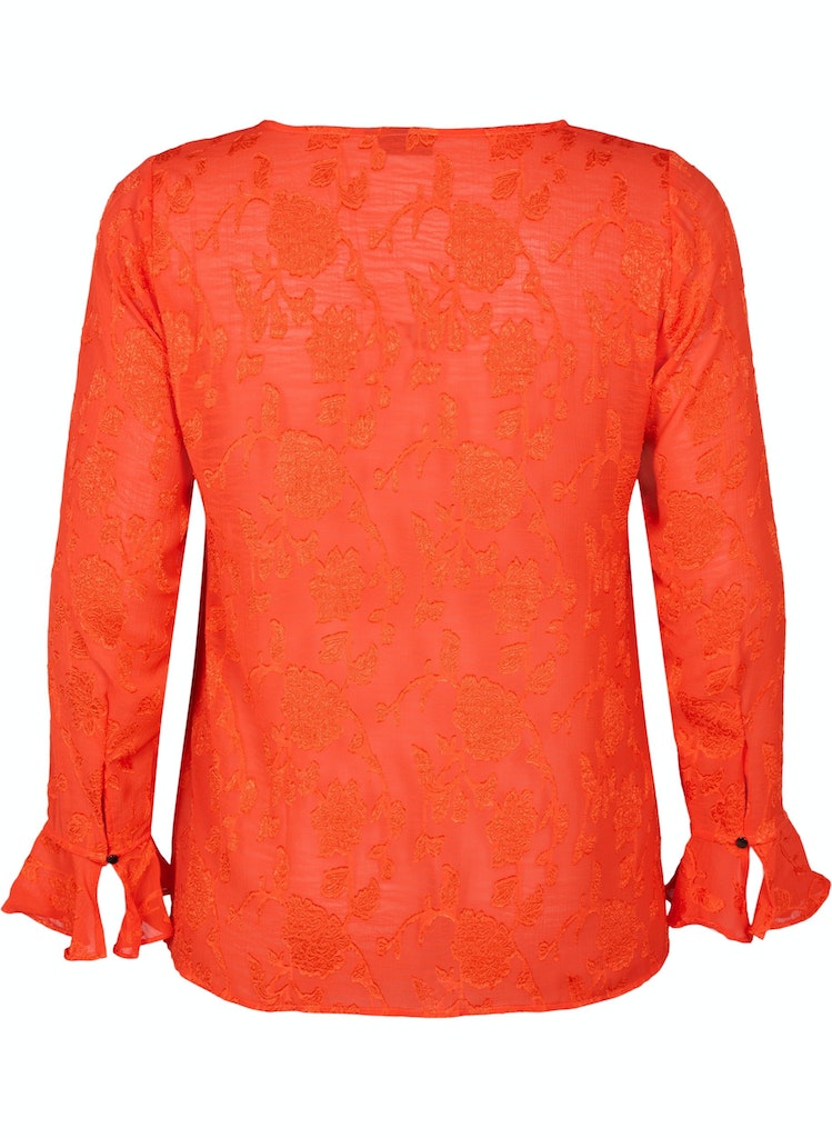V-hálsmál, síðar ermar með pífu að neðan, efnið er hálf-gegnsætt með blómamynstri. Flott yfir fínlega brjóstahaldara eða hlýrabol.