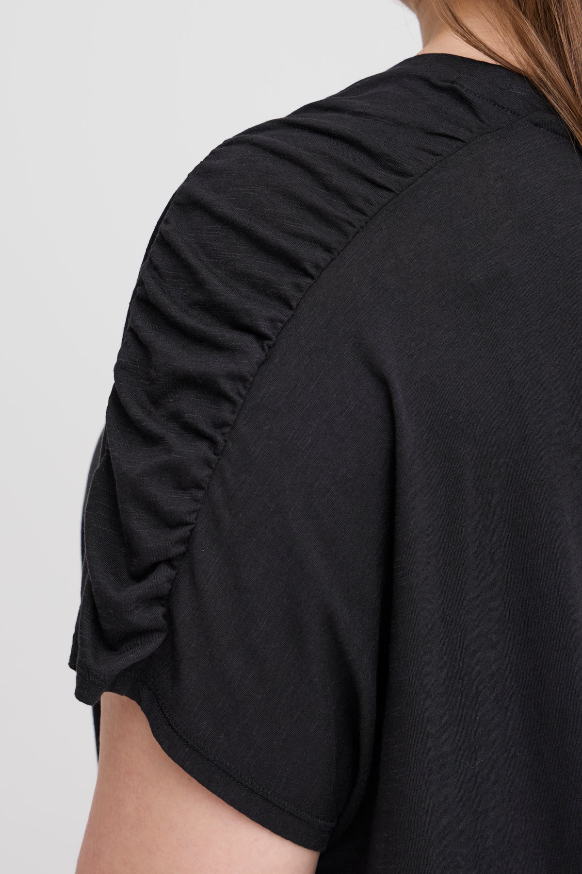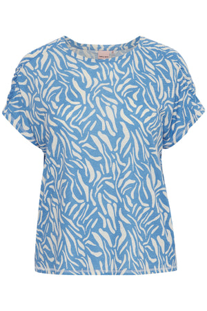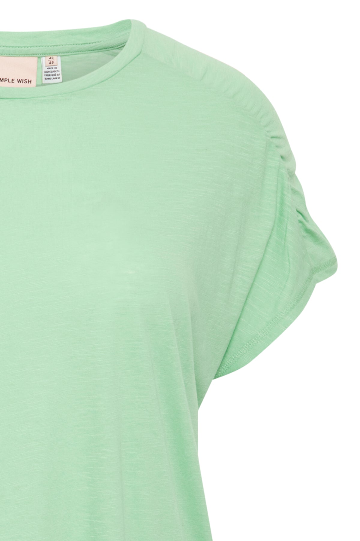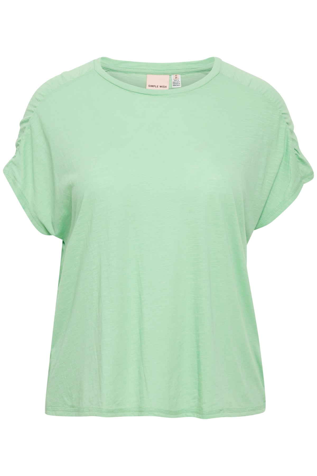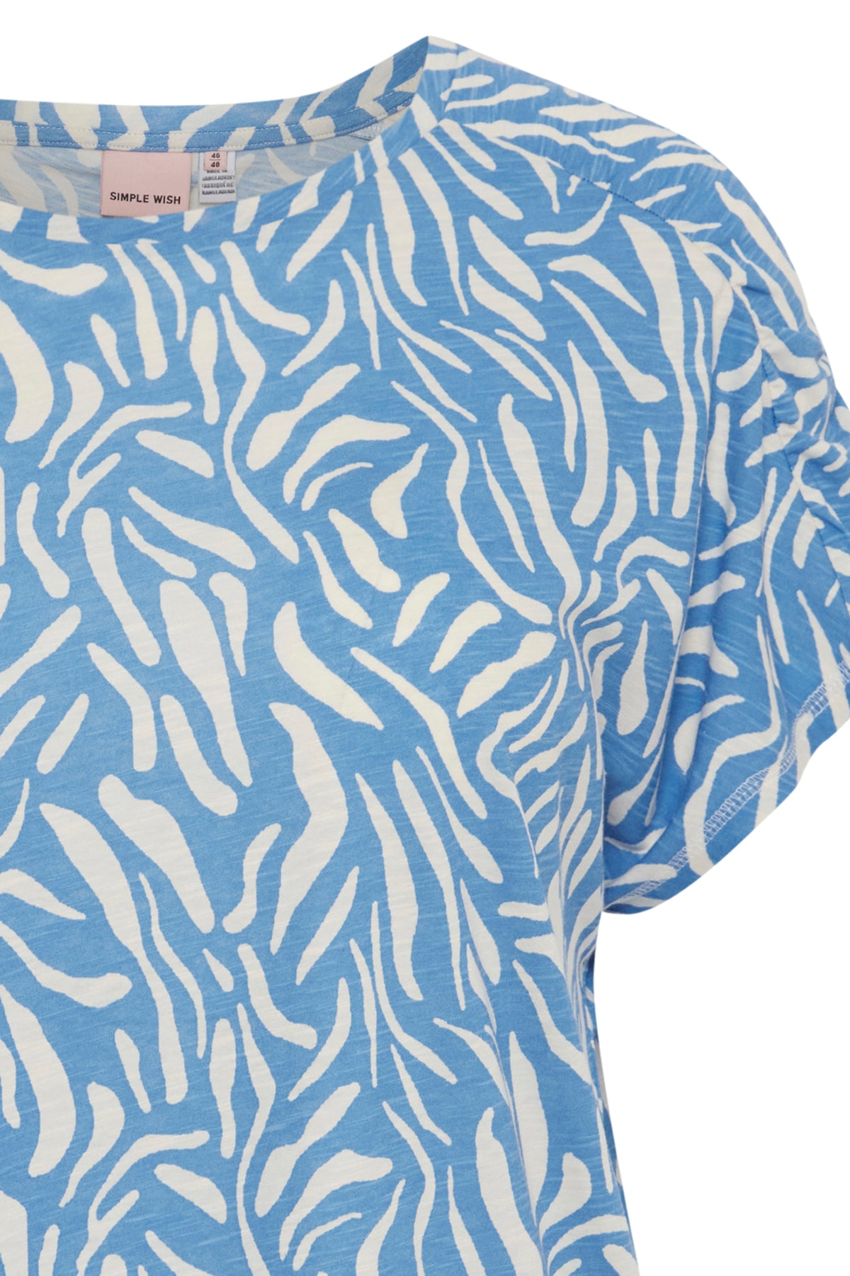 Laust snið og klassískt hálsmál ásamt stuttum ermum með rykkingu að ofan.