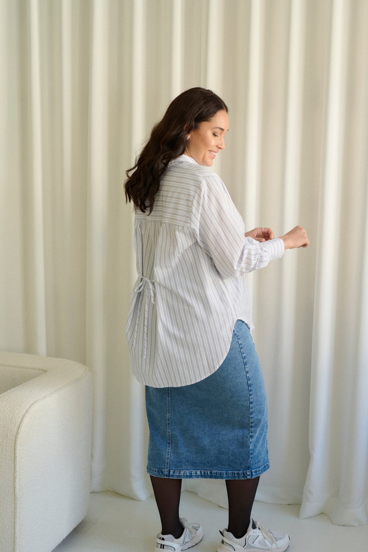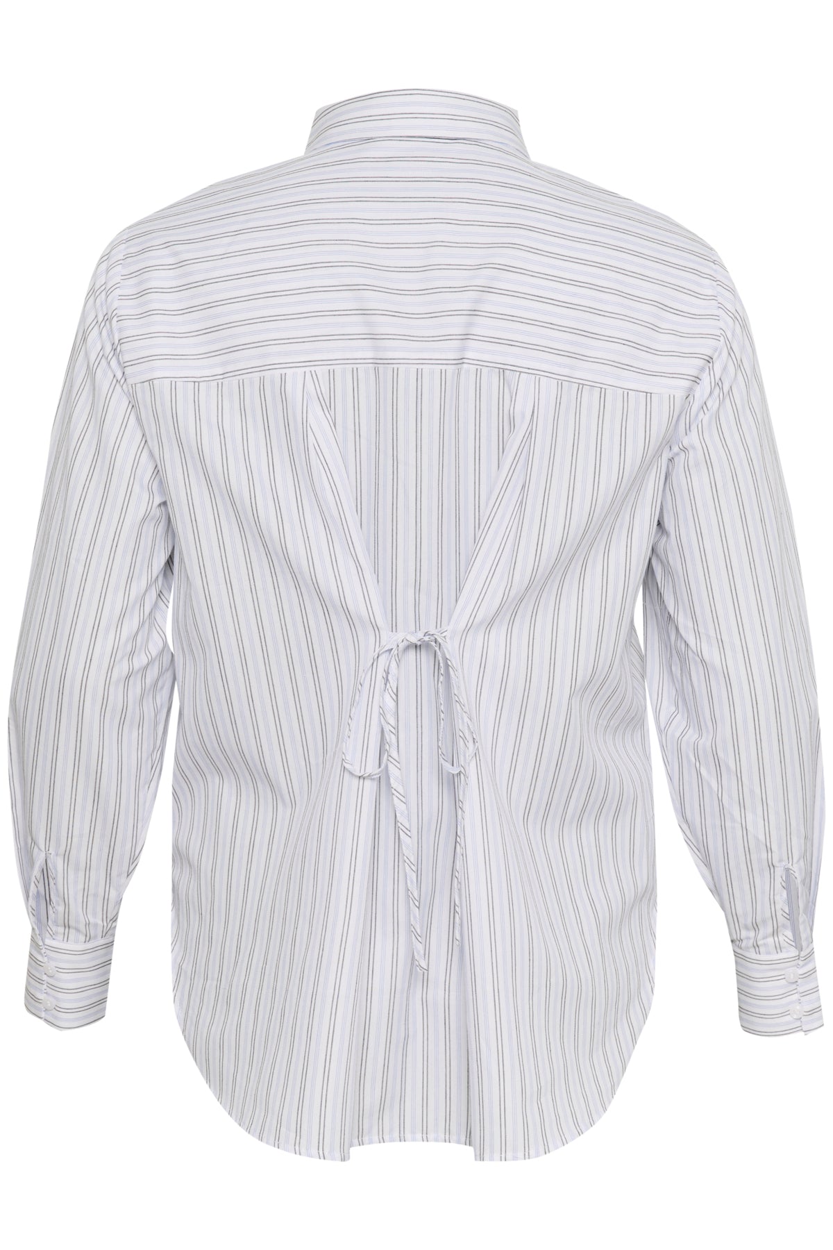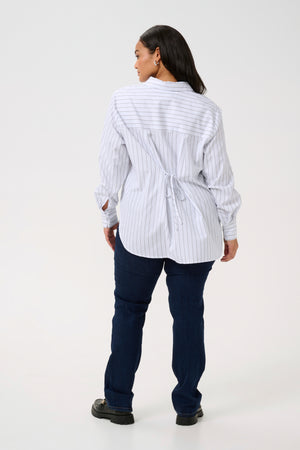 Skyrtan er með hneppt alla leið niður ljós með bláum og svörtum röndum. En það sem gefur skyrtunni þetta fashion "fashion- look" er að aftaná bakinu er hægt að binda skyrtuna saman.