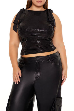 Glansandi ermalaus toppur með slaufum á öxlunum.