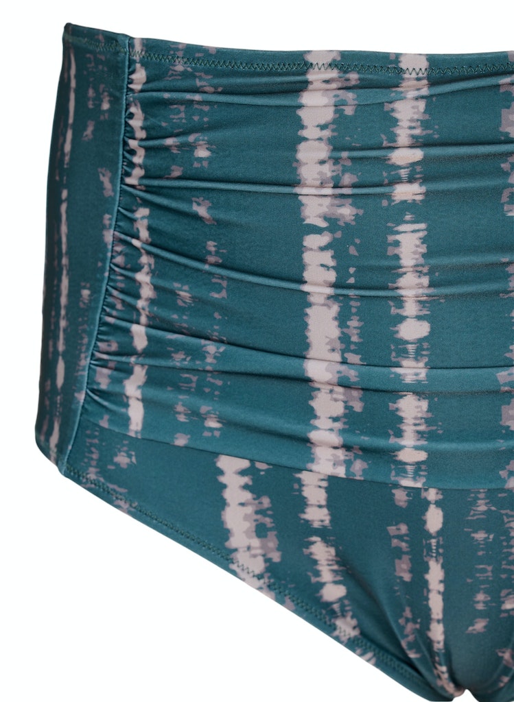 Buxurnar eru háar upp og með klæðilegum rykkingum í hliðunum.