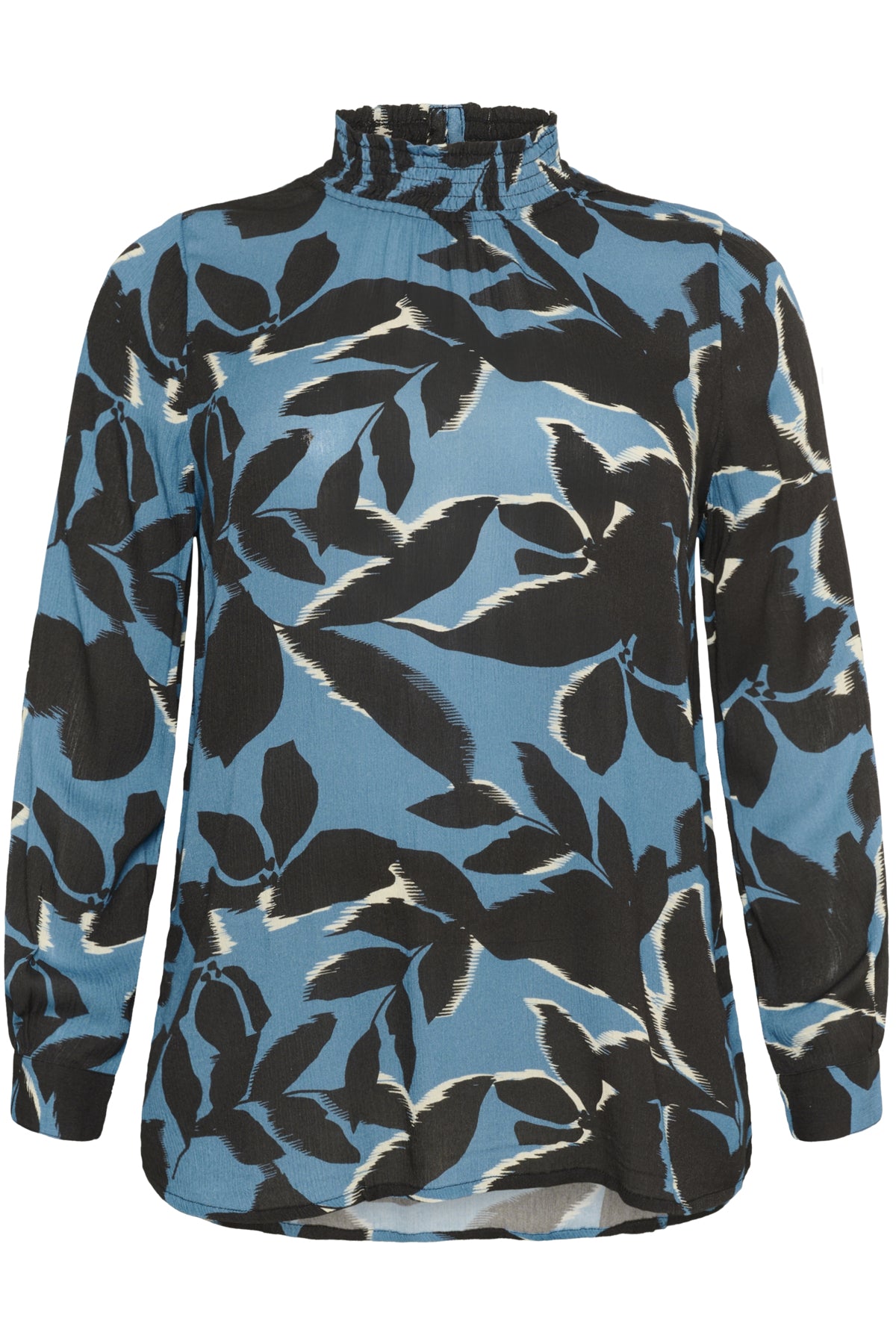 Blússan er í lausu sniði, síðar ermar, hátt hálsmál og svo létt teygjustroff í hálsmáli og neðst á ermum