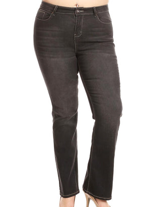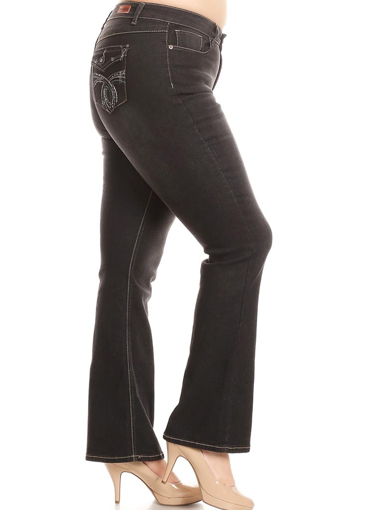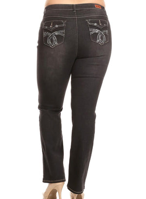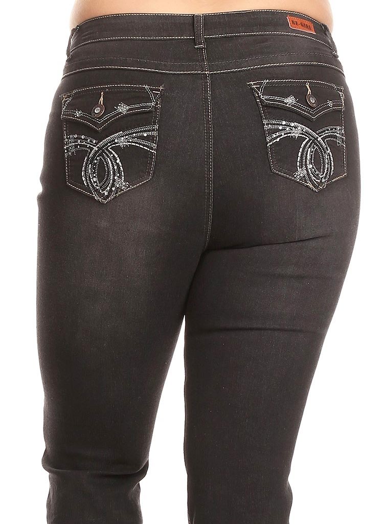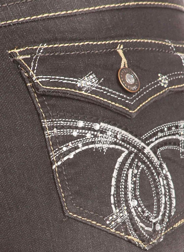 Geggjaðar dökkgráar gallabuxur með skrauti á rassvösunum eins og er svo vinsælt núna.
