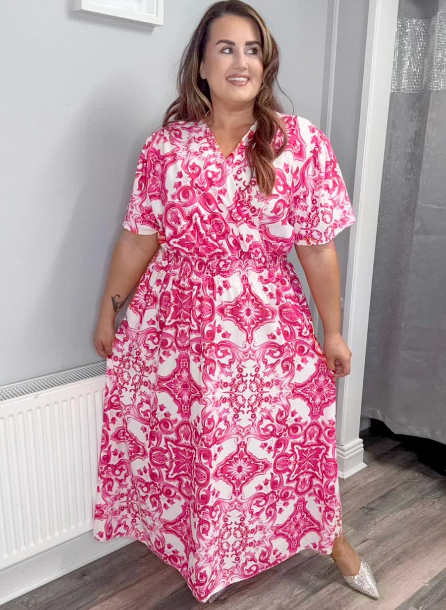 Klassískur síður kjóll með V-wrap hálsmáli, létt teygja í mittinu og faldir vasar á hliðunum.