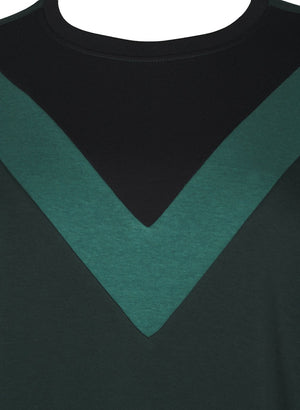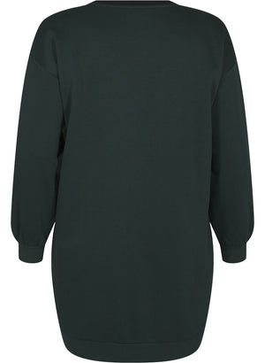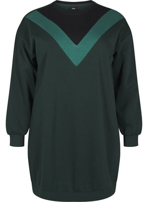 Kjóllinn er dökkgrænn í grunninn með grænu og svörtu við hálsmálið.