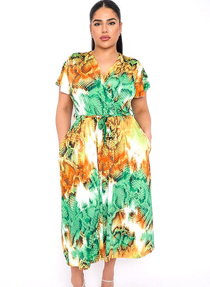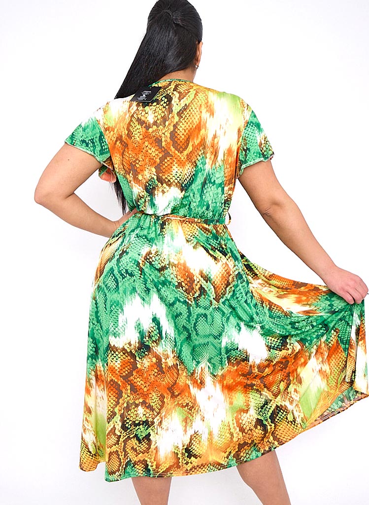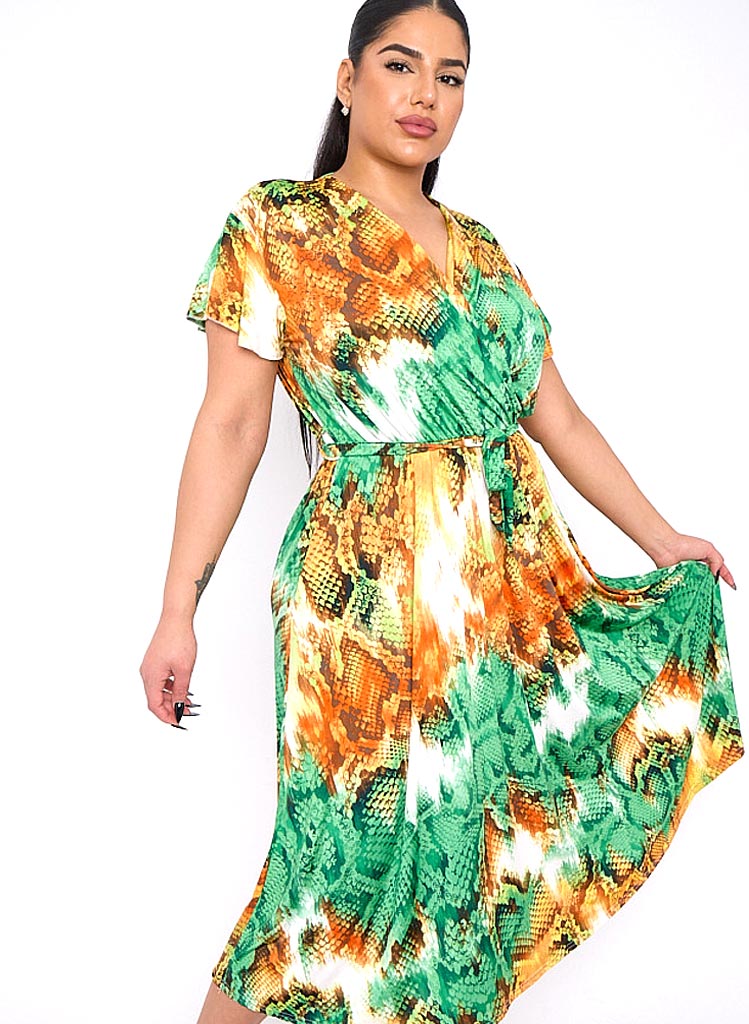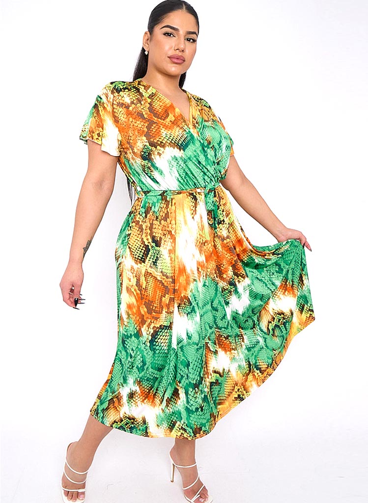 Wrap hálsmál, teygja í mittinu og mjög góð teygja í efninu.