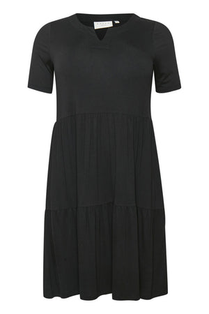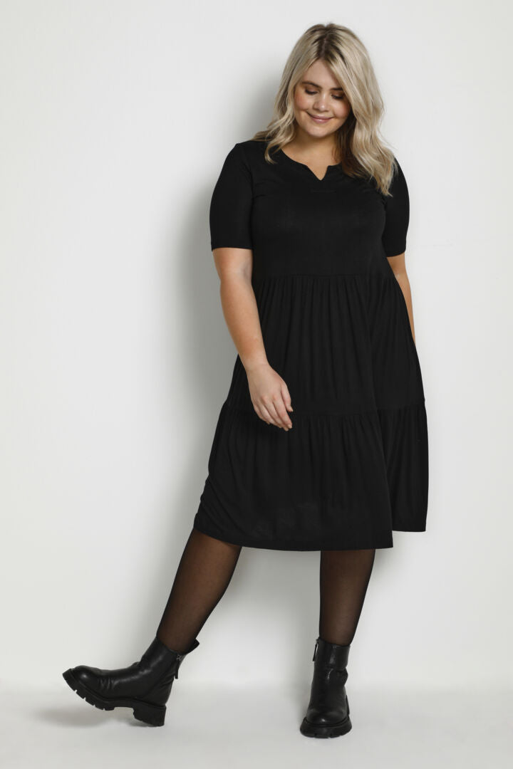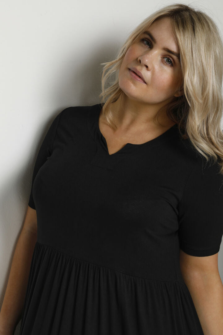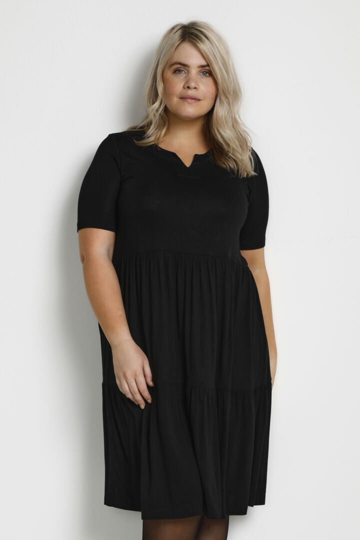 Sniðið er flæðandi A-snið með lagskiptu pilsi.