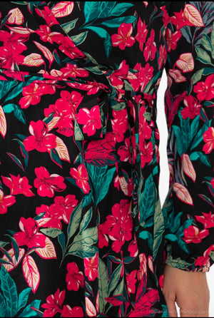 V-laga hálsmál, síðar ermar og tekinn saman í mittinu með teygju og beltisborði fylgir með.