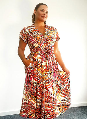 Wrap hálsmál, teygja í mittinu og mjög góð teygja í efninu.