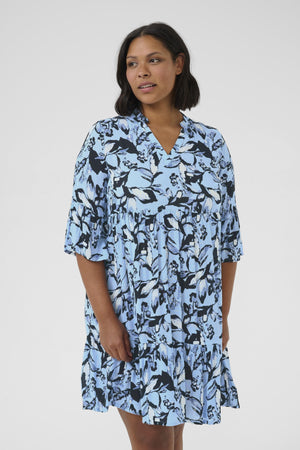 Kjóllinn er ljósblár í grunninn með stóru abstract blómamynstri.