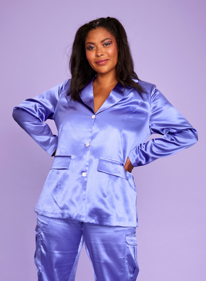 Ótrúlega skemmtilegur blazerjakki úr glansandi satín efni.