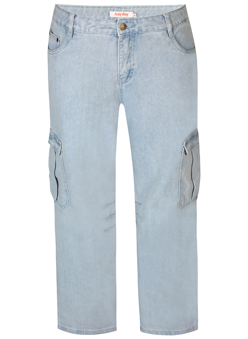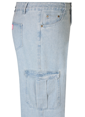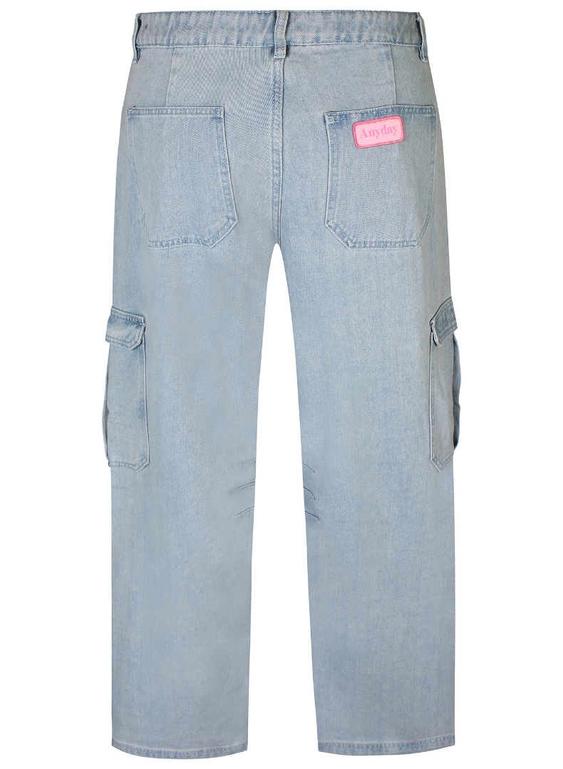 Flottar gallabuxur með 'Cargo' vösum á hliðunum. Sniðið er beint og þægilegt, ná hátt upp í mitti og liturinn er klassískur ljósblár.