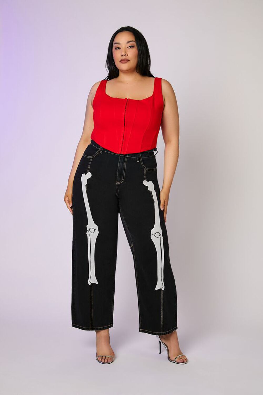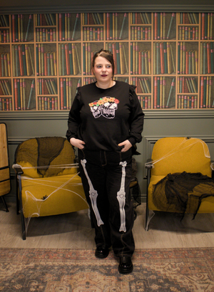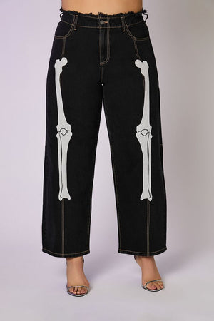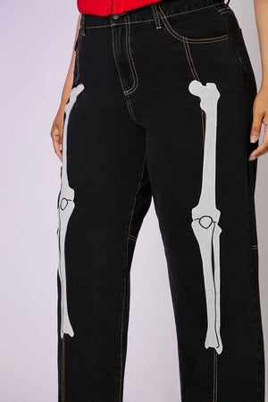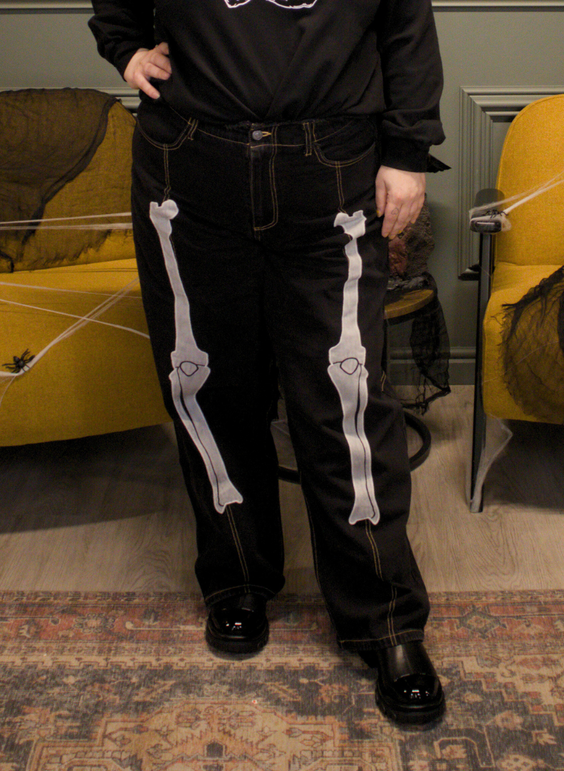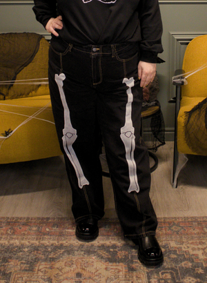 Buxurnar eru svargráar á litinn með ásaumuðu beinagrinda