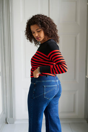Klassískar beinar gallabuxur, háar upp og snið sem faðmar og ýtir upp rassinum!