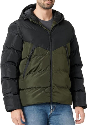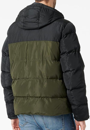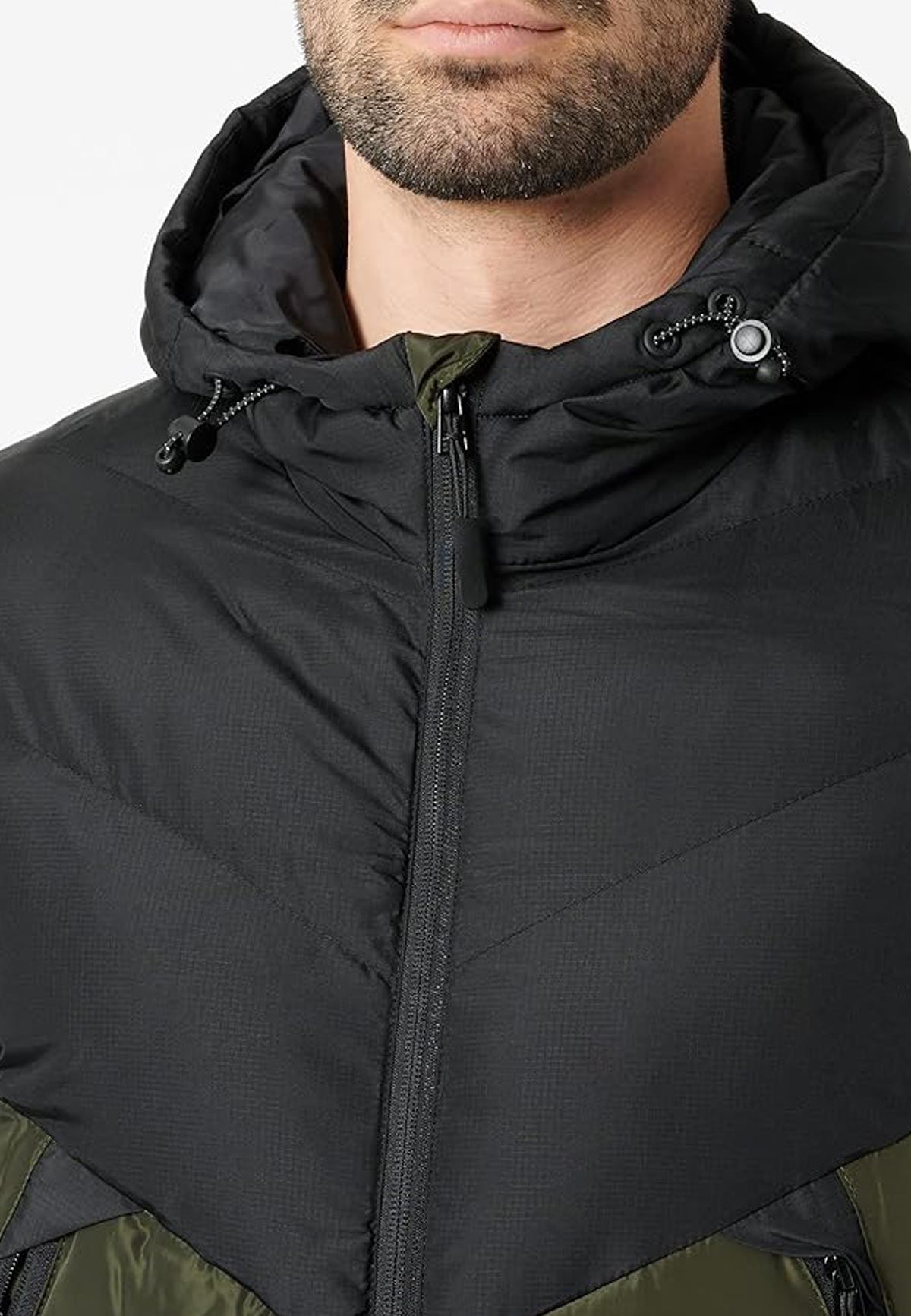 Úlpan er græn og svört á litinn tveir stórir vasar að framan og vasi innaní úlpunni.
