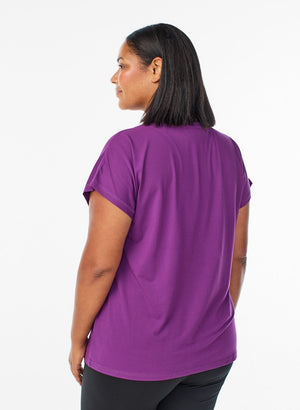 Rúnnað hálsmál og stuttar lausar saumlausar ermar.