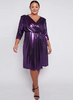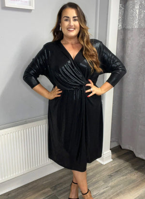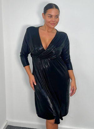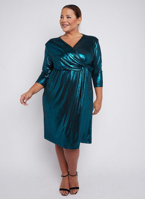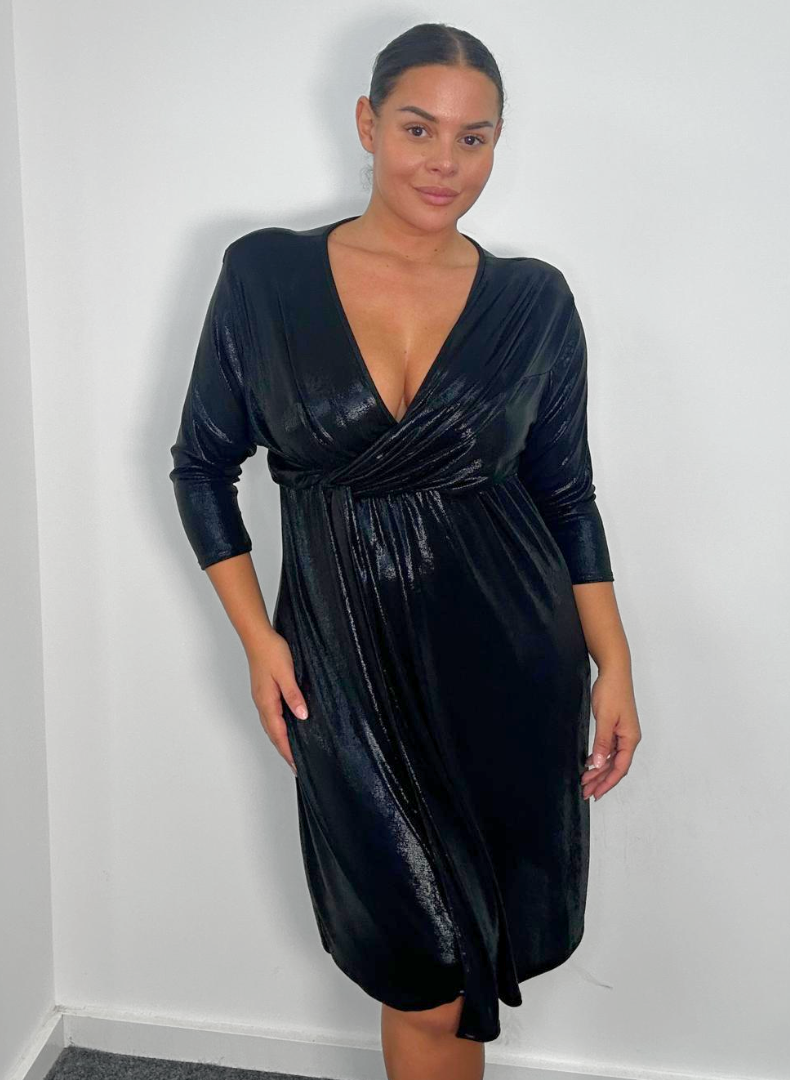 Kjóllinn er úr teygjanlegu efni með rykkingum sem klæða vel og wrap hálsmáli.