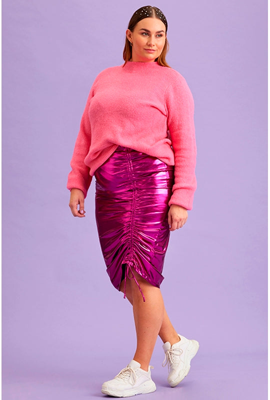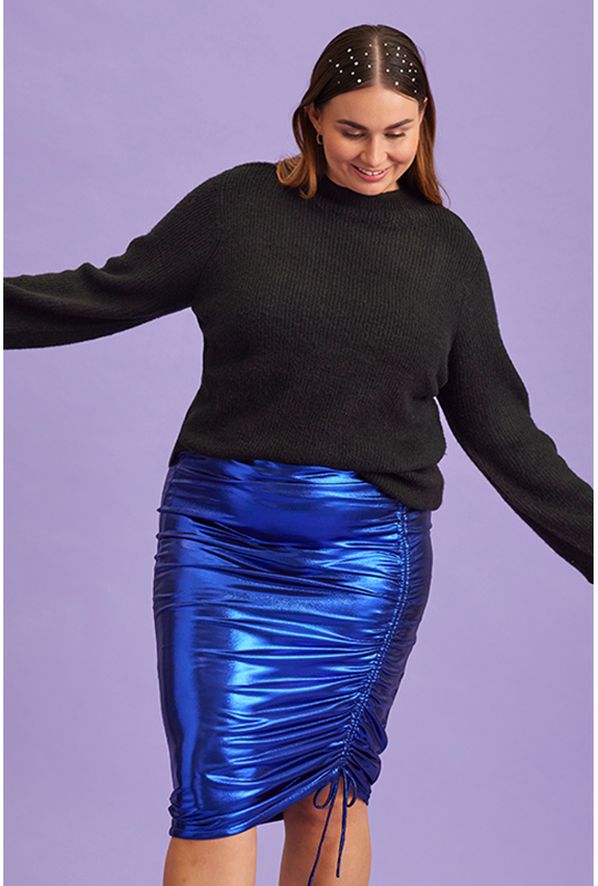 Síddin á pilsinu er í millisídd en hæg tað rykkja umm öru megin.