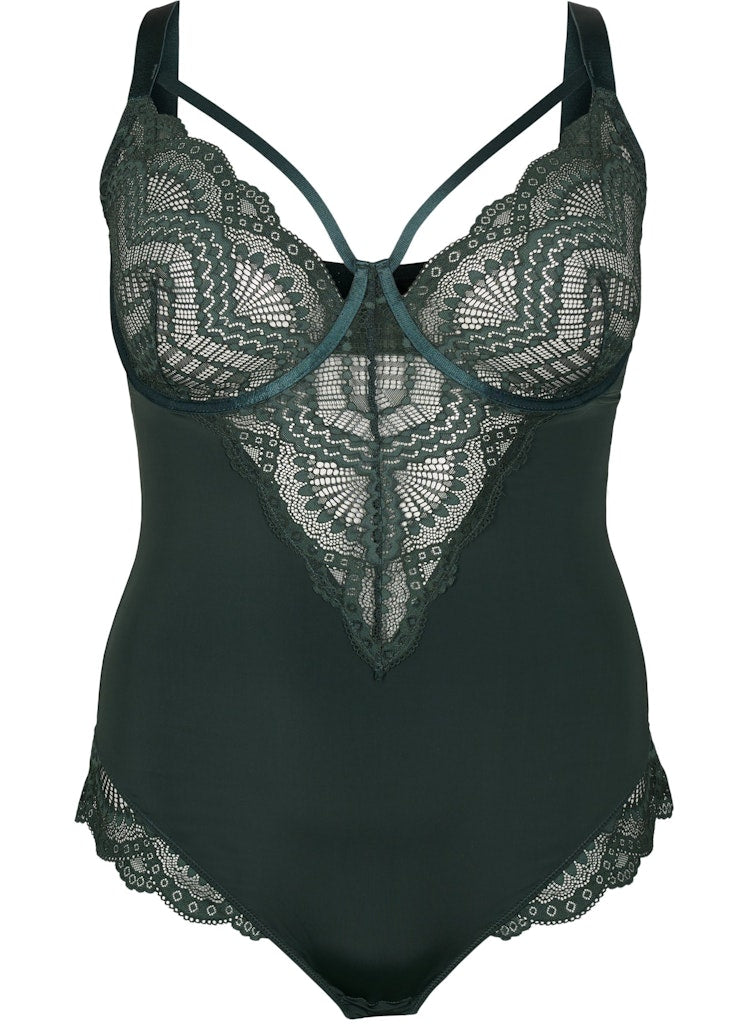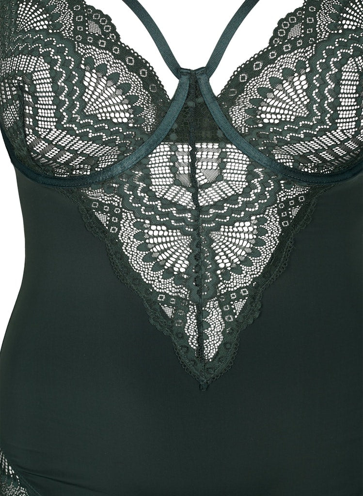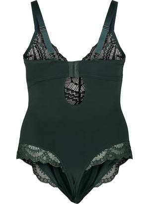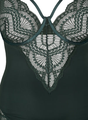 Fínleg og vönduð dökkgræn blúnda og teygjanlegt sleipt efni.