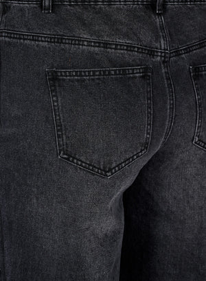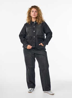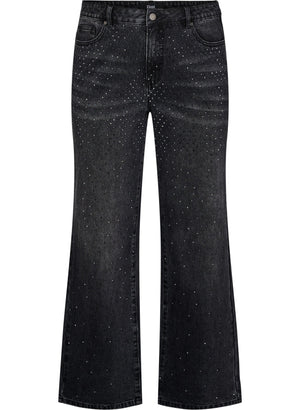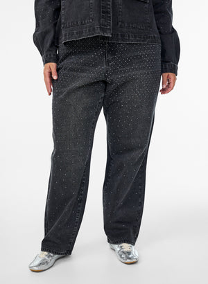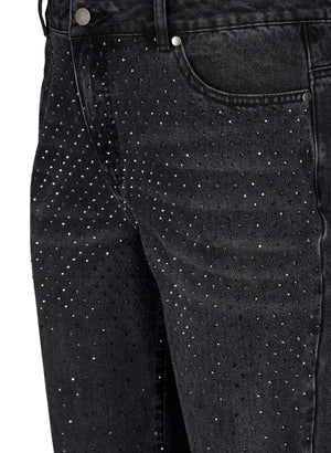 Þessar gráu gallabuxur eru ekkert smá flottar þaktar með litlum glitrandi gráum skraut steinum að framan.